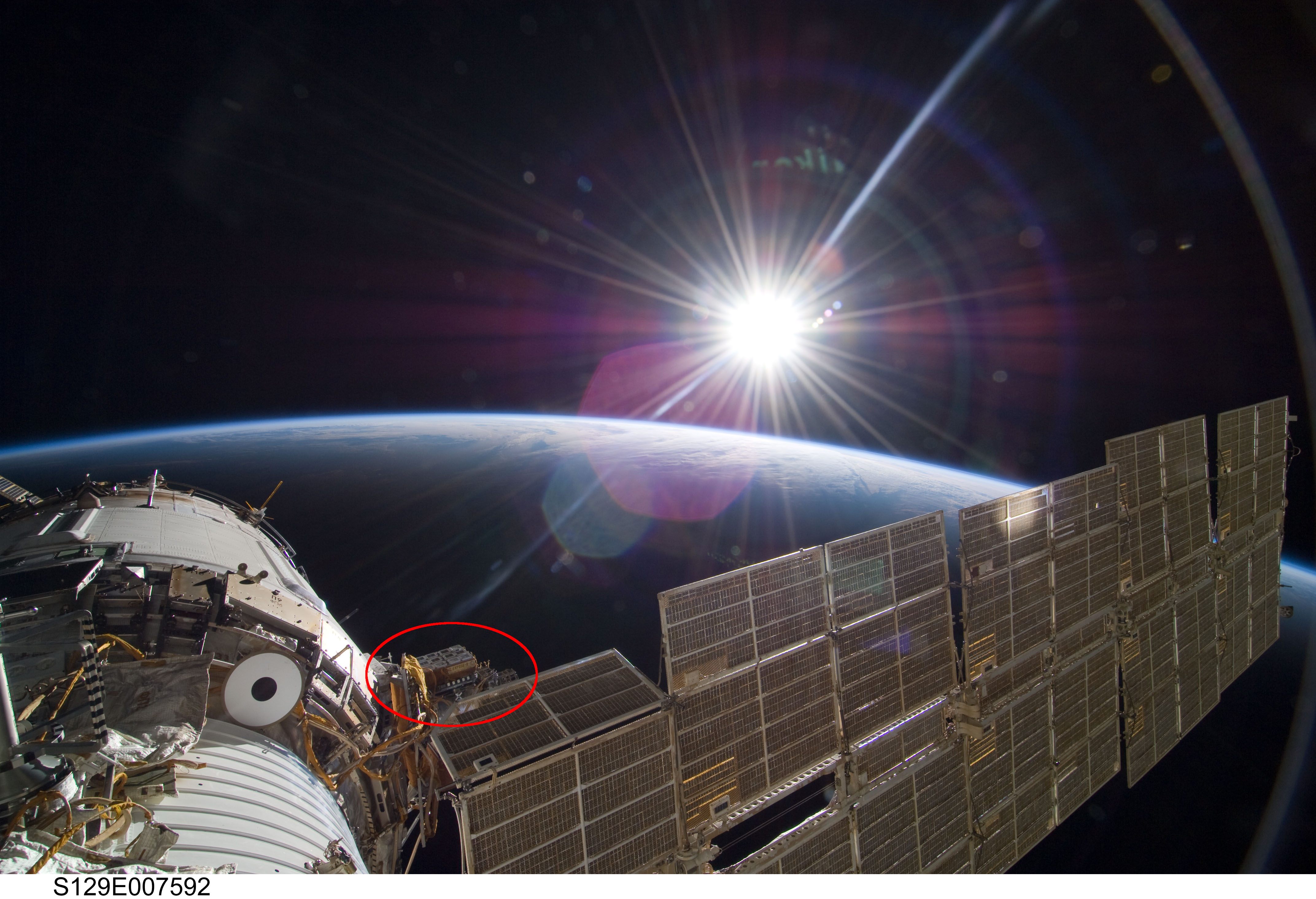 Fotos: Abb. 1: Internationale Raumstation (ISS). Zwischen dem Swesda-Modul und der Solarpanele ist die EXPOSE-R Plattform zu erkennen (rot umrandet). Dort werden die Moose und die anderen Organismen integriert und bis zu 18 Monate lang den Weltraumbedingungen ausgesetzt. Foto: ESA