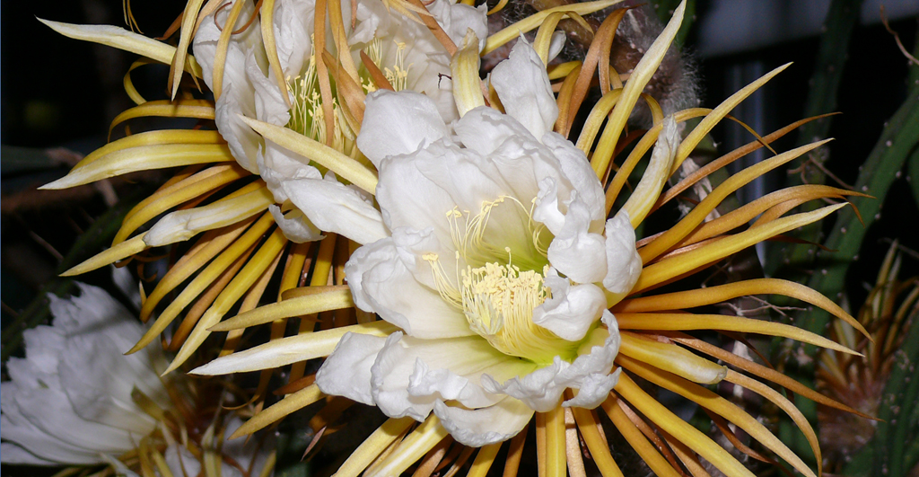 Die „Königin der Nacht“ ist ein Kaktus aus den Trockengebieten Mittelamerikas und der Karibik. Ihre riesigen, bis zu 30 cm großen Blüten öffnen sich jeweils nur für eine Nacht. Die Blütenöffnung geht so schnell, dass die Bewegung sogar mit bloßem Auge wahrnehmbar ist. Die Blüten sind innen weiß und außen karamellfarben und duften stark und angenehm. Das Blühereignis ist immer erst am Vormittag desselben Tages vorhersagbar. Wir erwarten heute 15 Blüten!