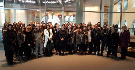 Das in der Öffentlichkeit bereits viel beachtete Programm zur Weiterqualifizierung von geflüchteten Lehrkräften an der Universität Potsdam findet mehr und mehr auch in der Politik Anklang: Unlängst hatten sich die brandenburgische Arbeitsstaatssekretärin Almuth Hartwig-Tiedt und die Integrationsbeauftragte des Landes Brandenburg Dr. Doris Lemmermeier vor Ort über das Programm informiert. Nun haben auf Einladung der Potsdamer Bundestagsabgeordneten Annalena Baerbock insgesamt 43 Teilnehmerinnen und Teilnehmer sowie Dozentinnen und Dozenten des Refugee Teacher Programms am 25. November den Deutschen Bundestag besucht.