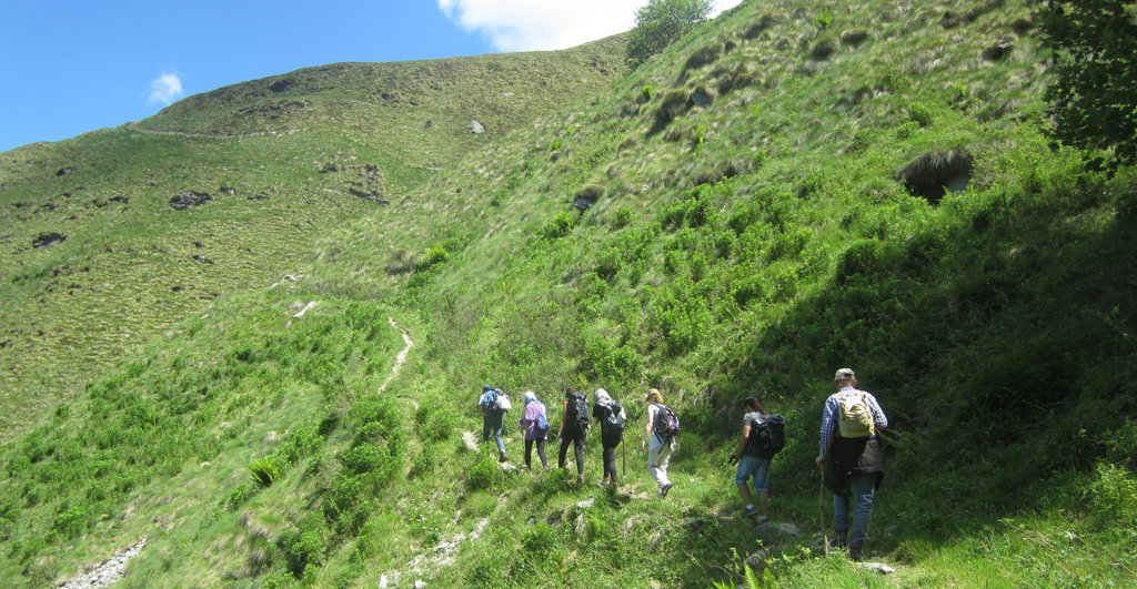 Wir laufen weiter zur Alpe Scarpiola auf 1.400 m Höhe, wohin Graziella, Anna und Corrado morgen ihre Tiere bringen werden. Von dort werden sie dann den Käse täglich hinunter ins Dorf bringen und die Lebensmittel, die sie brauchen, aus dem Dorf in die Alpe hinauftragen. Immer wieder wird uns in der heißen Sonne bewusst, wie eng Raum und Zeit verbunden sind und den Alltag der hier lebenden Menschen bestimmen. Am dritten Tag sehnen wir uns schon nach einem Bus. Zu Hause gehen wir oft nur kleine Distanzen bis zur nächsten Busstation. Im Sesiatal hingegen laufen wir oft Stunden, um an einer neuen Etappe anzukommen. Nachdem wir die Alpe besichtigt haben, in der bereits viele Häuser verfallen sind, steigen wir zur kleinen Kirche nach Sella ab. Denn dort findet heute Nachmittag eine Prozession und ein Incanto dello Offerte mit dem Pfarrer Don Guiseppe statt. Er ist Mitte 60 und versorgt die Kirchen der 16 rimellesischen Gemeinden abwechselnd. Die meisten erreicht er nur zu Fuß. Um die Messe nicht zu verpassen und bei der Versteigerung von Wein und Kuchen für den Erhalt der kleinen Kirche mitbieten zu können, legen wir einen Schritt zu. Wir schaffen es gerade noch pünktlich und erleben, wie wichtig das soziale Zusammentreffen und der Glaube für die Menschen im Valsesia ist. Wir haben eine Schachtel Kekse als Spende dabei und ersteigern einen Likör. Die Rimellesen bieten uns anschließend die von ihnen ersteigerten Kekse an. Als sich die Versammlung auflöst, halten Louise und Jessika neben der Kirche im Schatten ihr Referat. Sie sprechen über traditionelle Arbeitsweisen, Almwirtschaft und Erosion, aber auch über Hausbau und Holzwirtschaft. Danach geht es wieder talabwärts! Im Fontana erwartet uns schon Seniora Ada mit ihren Hühnern auf der Terrasse. Sie hat gerade ihren Garten gegossen und trällert uns ein Liedchen. Sie ist in Rimella geboren und erzählt uns, wie sie als junge Frau mit der Sichel und der Kiepe auf dem Rücken zur Bisse rosso hinaufzog, um Futter für die Tiere zu schneiden oder in dem hoch gelegen La Res Holz holte. Es war eine harte körperliche Arbeit, die sie bereits als Kind verrichten musste. Stolz holt sie uns ein Bild aus ihrem Haus, das sie, als junge Frau in regionaler Tracht gekleidet, zeigt. Damals war sie 22 Jahre alt und bildhübsch. Sie schwelgt in Erinnerungen über den ersten Kuss, die Tanzabende und ihren Ehemann. Tanzen kann sie heute nicht mehr, aber ihr Lied klingt noch immer durch die Gassen von Rimella. Die Kirchturmglocken läuten und es ist wieder spät geworden. Heute haben uns die „Powerfrauen“ Graziella, Anna und Ada tief beeindruckt und mit ihren Geschichten ein Fenster in eine andere Zeit geöffnet. Gestern hatten uns Dennis und Nando von ihrem Arbeitsalltag in den Bergen berichtet und heute konnten wir bei Graziella und Ada erleben, was es heißt, als Frau in den Bergen zu leben und auch im hohen Alter körperlich schwere Arbeit zu leisten. Wir sind voller Respekt und Bewunderung.