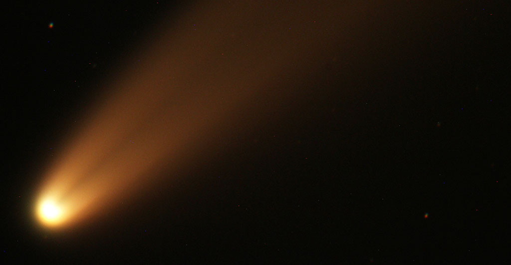 Kometen bestehen überwiegend aus Staub, Eis und Gestein und stammen aus dem äußeren Sonnensystem. Sie bewegen sich auf elliptischen oder hyperbolischen Umlaufbahnen um die Sonne. Je näher ein Komet der Sonne kommt, desto mehr Gas verdampft durch die Sonneneinstrahlung. Dabei formt sich eine Hülle aus Gas und Staub um den Kometenkern, die vom Sonnenwind verweht wird und einen charakteristischen, mehrere Millionen Kilometer langen Kometenschweif bildet. Durch die intensive Beleuchtung der Sonne wird der Schweif sichtbar, wenn sich der Komet der Erde nähert.