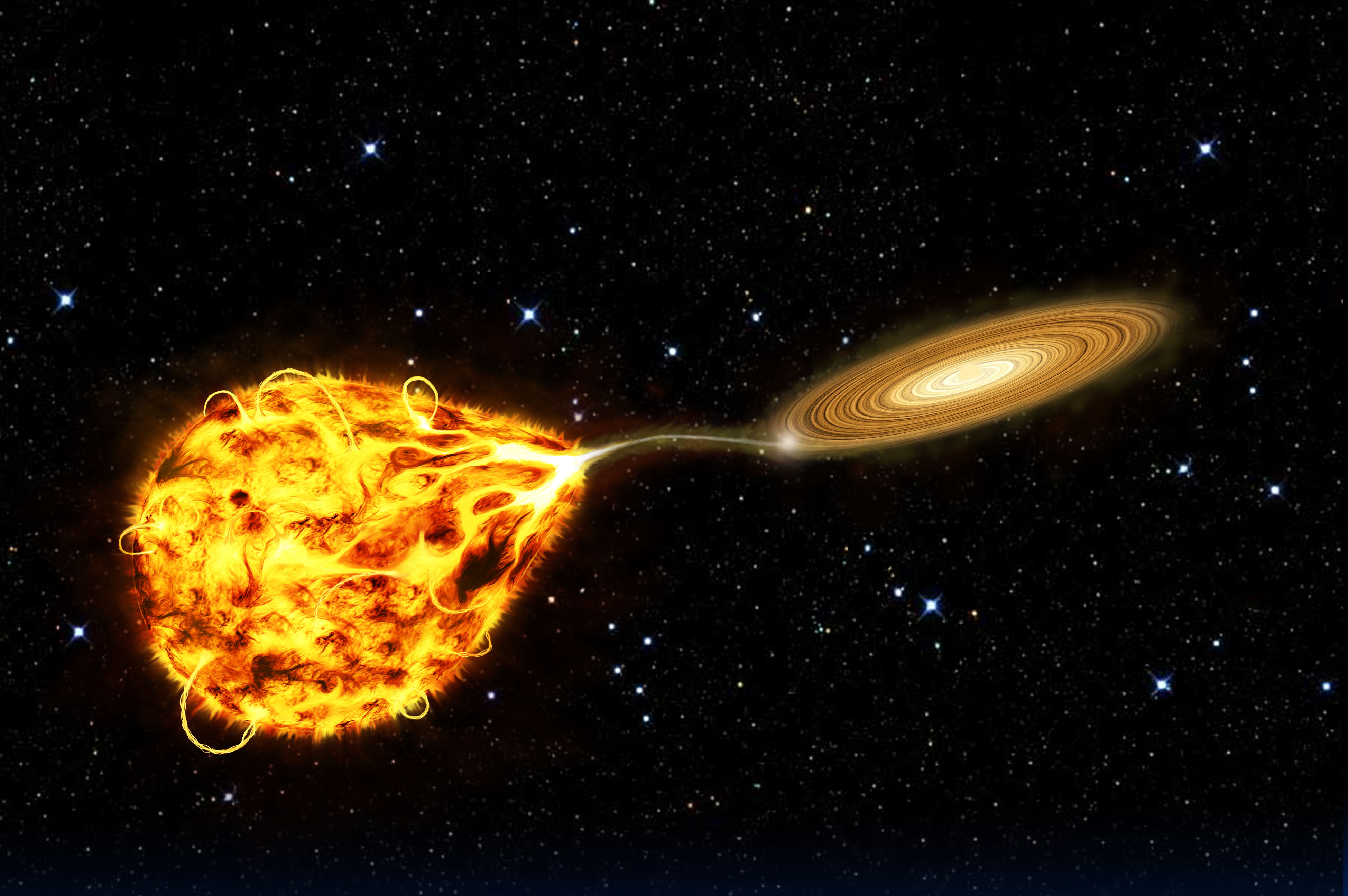 Abbildung: Künstlerische Darstellung des Masseverlustes eines Roten Riesensterns aufgrund der Anziehungskraft seines sonnenähnlichen Begleiters. Abbildung: Joris Vos