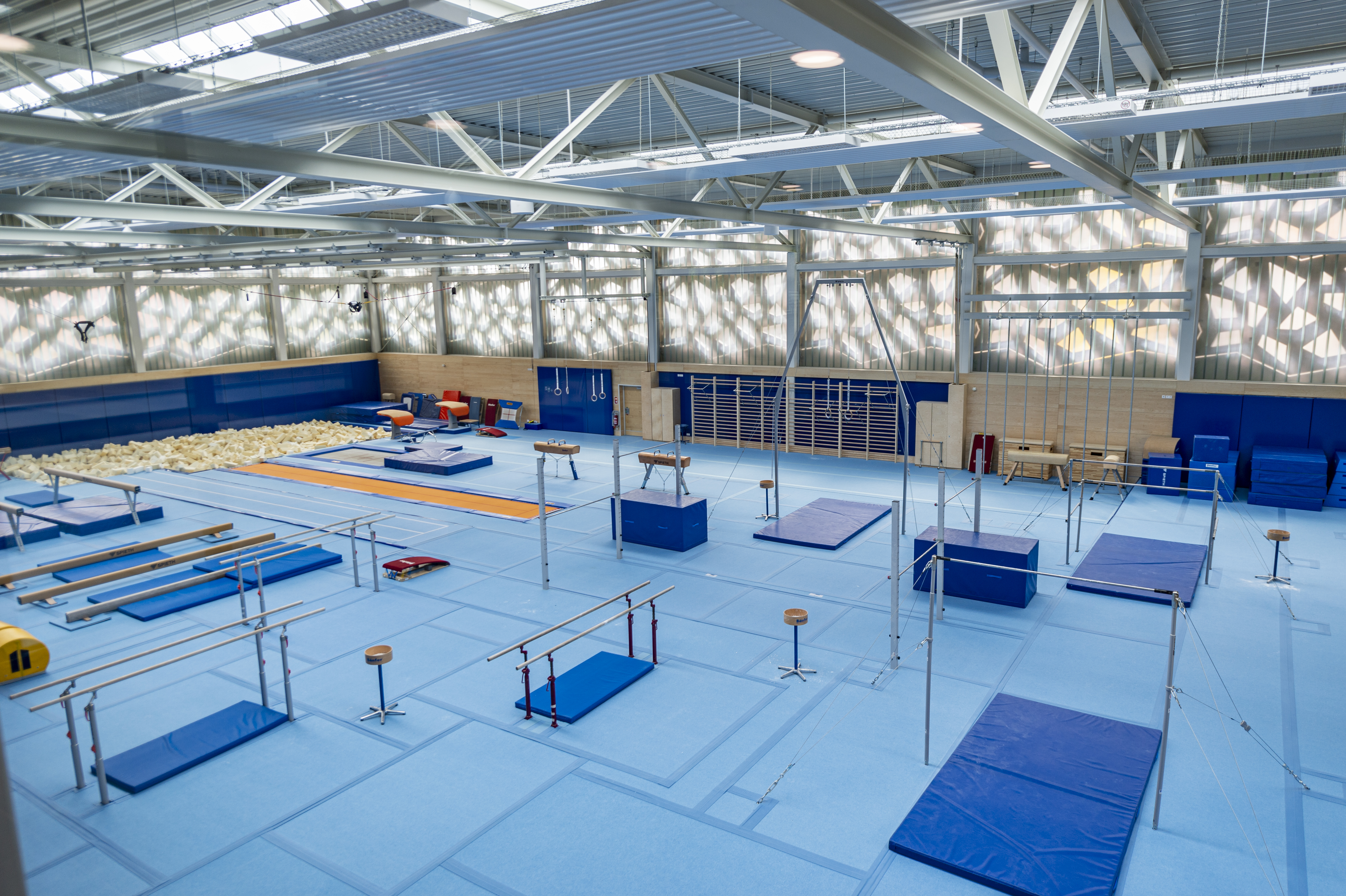 Herzstück der neuen Anlage ist die rund 1.250 Quadratmeter große Gerätturnhalle mit Schnitzelgruben, Trampolinbahnen sowie Frauen- und Männerwettkampfgeräten. Hinzu kommen zwei Mattenhallen mit jeweils ca. 320 Quadratmetern sowie ein Kraftsport- und ein Schulungsraum. Die neue Halle, mit deren Bau im September 2017 begonnen wurde, war bereits im Herbst 2020 fertiggestellt und übergeben worden. Aufgrund der Corona-Pandemie wird sie jedoch erst jetzt offiziell eröffnet. Der Neubau war notwendig geworden, weil die bisher genutzte Halle, das älteste Gebäude auf dem Areal, verschlissen war und bereits mehrfach vor der Schließung stand.