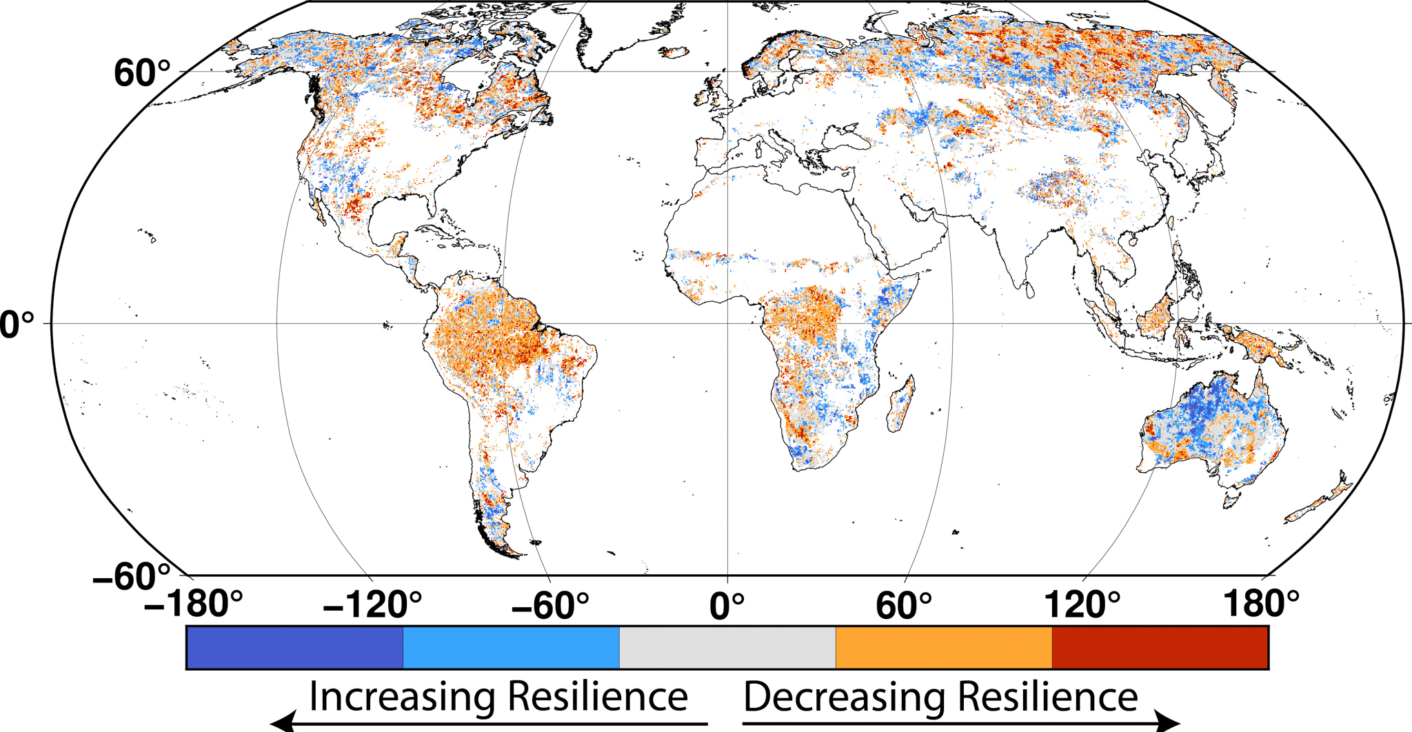 Abbildung: Globale Trends in der Widerstandsfähigkeit der Vegetation seit den 2000er Jahren. Viele Regionen – insbesondere die tropischen Regenwälder und die sibirische Tundra – sind weniger in der Lage, ihren derzeitigen Zustand angesichts sich ändernder Umweltbedingungen aufrechtzuerhalten. Bildrechte: Taylor Smith.