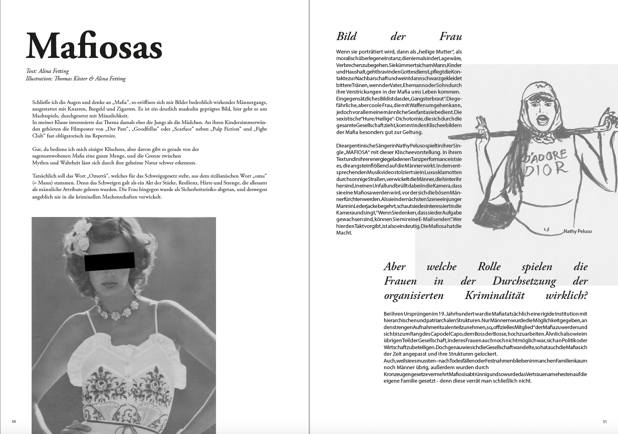 Das Layout wirkt minimalistisch und dabei ausdrucksstark: Die aktuelle Ausgabe zum Thema „Mafia“ ist bis auf das Titelblatt ganz in Schwarz und Weiß gehalten, mit „selbstgemachten“ Fotos und Zeichnungen. Das hat etwas von einem Gesamtkunstwerk! Dazu Interviews, Reportagen, Reflexionen und literarische Formate. Welchen Anspruch habt ihr an Gestaltung und Textformen?