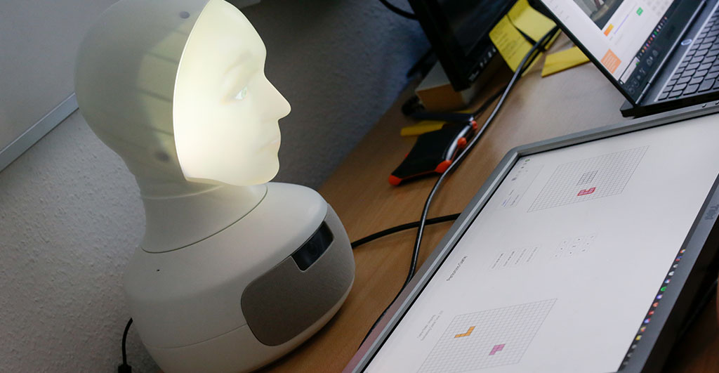 „Mit Maske versteht er einen schlecht“, entschuldigt Maike Paetzel-Prüsmann ihren Gesprächspartner Furhat, mit dem sie gerade Pentomino gespielt hat. Furhat ist ein Roboter in Form eines menschenähnlichen Kopfs. In dem Computerspiel, das an den Klassiker Tetris erinnert, hat die Informatikerin dem Roboter Anweisungen gegeben, wohin er eine geometrische Form legen soll. Mehr als einmal fallen sich die beiden ins Wort, doch Furhat hat Humor und das Talent, soziale Spannungen in Wohlgefallen aufzulösen. „Die Studierenden haben seine witzigen Antworten programmiert“, sagt die Informatikerin. Und die können auch für die Wissenschaftlerin hin und wieder überraschend sein.
