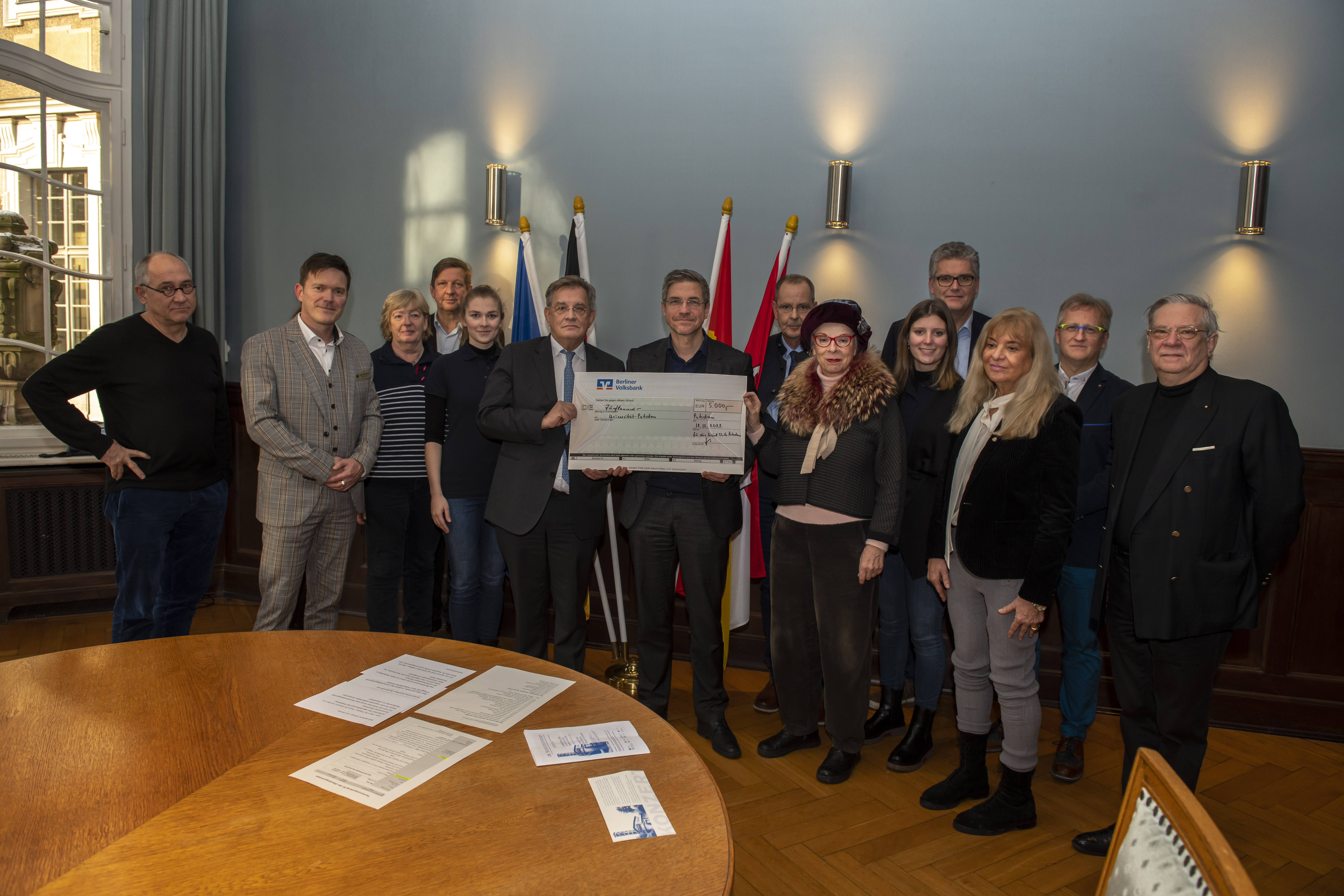 Foto: Potsdams Oberbürgermeister Mike Schubert und der Vizepräsident für Internationales und Fundraising der Universität Potsdam Prof. Dr. Florian Schweigert mit Vertreterinnen und Vertretern der Potsdamer Serviceclubs bei der Scheckübergabe am 12. Dezember im Stadthaus. Foto: Thomas Roese.
