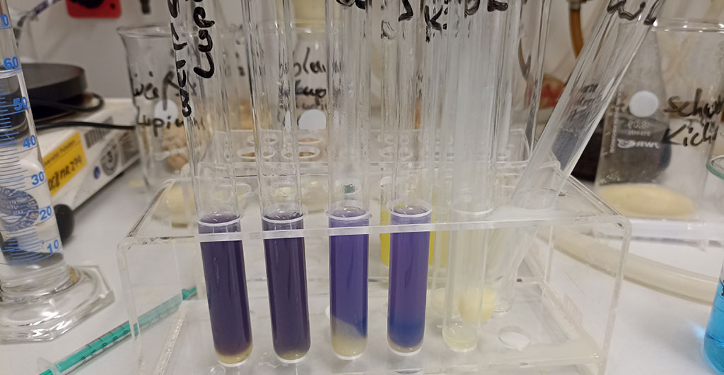 „Wir haben bewusst regionale Pflanzen gewählt, damit die Schülerinnen und Schüler einen größeren Bezug haben“, erzählt ihre Betreuerin, die Chemiedidaktikerin PD Dr. Jolanda Hermanns. „Und die Blaue Süßlupine ist eine brandenburgische Züchtung, die heute weltweit kultiviert wird.“ 1929 wurde am damaligen Kaiser-Wilhelm-Institut für Züchtungsforschung in Müncheberg die erste bitterstoffarme Süßlupine angebaut, die für Mensch und Tier leichter verdaulich ist. Während die Kichererbse ohne größeren Aufwand als Humus oder Falafel zubereitet werden können, ist die Verarbeitung von Lupinen aufwendiger. Oft wird daraus ein Protein-Isolat hergestellt, aus dem nicht nur Burger, Würstchen und Aufstrich, sondern auch Quark oder Eis gemacht werden. Geröstet sind sie sogar als Kaffee genießbar. Gleichzeitig hat die Lupine weit mehr Eiweiß als die Kichererbse. „Das Spannende an der Bachelorarbeit ist, dass Michelle Seifert Lupinen und Kichererbsen differenziert betrachtet – von ihren Einsatzmöglichkeiten bis zu den unterschiedlichen Proteingehalten“, sagt der Zweitbetreuer, Dr. Moritz Reckling vom Leibniz-Zentrum für Agrarlandschaftsforschung (ZALF).