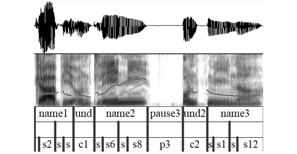 Unser Projekt, das sind drei Projektleiterinnen und drei Doktorandinnen, und wir arbeiten gemeinsam an drei verschiedenen Arbeitspaketen. Wir untersuchen, wie und unter welchen Bedingungen jüngere und ältere Menschen Prosodie einsetzen. Dazu nutzen wir Sätze, die exakt die gleichen Worte enthalten, aber unterschiedliche Bedeutungen haben, ja nachdem, wie die unterschiedlichen Satzteile gruppiert werden – also wie man die Prosodie einsetzt. Die ersten Studien in diesem Bereich haben mit mathematischen Gleichungen gearbeitet. Die Sprecher*innen mussten ihrem Gegenüber mathematische Aufgaben diktieren, wie „2+3*4“ – und die Hörer*innen mussten anhand der Prosodie erkennen, ob das Ergebnis 20 (also „(2+3)*4“) oder 14 („2+3*4“) ist. Wir arbeiten ähnlich, allerdings mit Sätzen wie „(Mona und Lili und Nina.)“ im Gegensatz zu „(Mona und Lili) und Nina.“. Im ersten Fall sind alle drei Personen zusammen und im zweiten Fall sind zwei Personen zusammen und eine Person alleine gemeint (siehe Abbildung). Außerdem wollen wir herausfinden, ob Menschen, die die Prosodie in ihrer Aussprache besonders gut oder deutlich einsetzen, auch besonders gut darin sind, prosodische Signale für das Sprachverständnis zu nutzen. Wir wissen, dass ein solcher Zusammenhang für Produktion und Verständnis einzelner Laute existiert, und wir erwarten, ihn auch auf der Ebene der Prosodie zu finden. Diese Studien helfen uns, die Repräsentation von Sprache im Gehirn besser zu verstehen. Daran arbeiten wir auch in dem zweiten Arbeitspaket. Hier untersuchen wir allerdings, wie Menschen mit einer Sprachstörung nach einem Schlaganfall, einer Aphasie, Prosodie für das Sprachverständnis nutzen können. Uns interessiert insbesondere, ob diese Menschen eher Probleme mit der Verarbeitung der Tonhöhe oder der Dehnung haben.