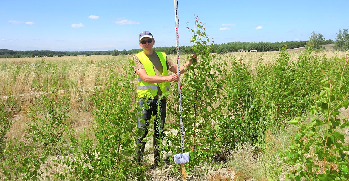 Das kann man auch auf einem 2,5 Hektar großen Areal in der Lausitz sehen, der Spreetaler Kippe. In schlimmster Erinnerung ist den Menschen vor Ort noch die schlammbraune, stinkende Spree, die vor einigen Jahren durch den Spreewald floss. Weil der Bergbau in der Nähe eingestellt worden war, stieg das Grundwasser und beförderte Eisenhydroxid-Schlämme in den Fluss. Blumenstein brachte diese ausgefällten Mineralien als Dünger auf die „Kippfläche“, eine Brache, auf der dadurch ein Wald entstand. Ein sichtbarer Erfolg, auch wenn das Ergebnis sozusagen verwässert wurde, bedauert Blumenstein. „Wäre nicht so viel Regen gefallen, hätte man die Wirksamkeit noch besser gesehen.“ Am deutlichsten dort, wo er und sein Team die Ausfällstoffe aus der Spree mit dem hauseigenen, patentgeschützten „Bodenbalsam“ vermischten, um damit den Boden der Brache anzureichern.