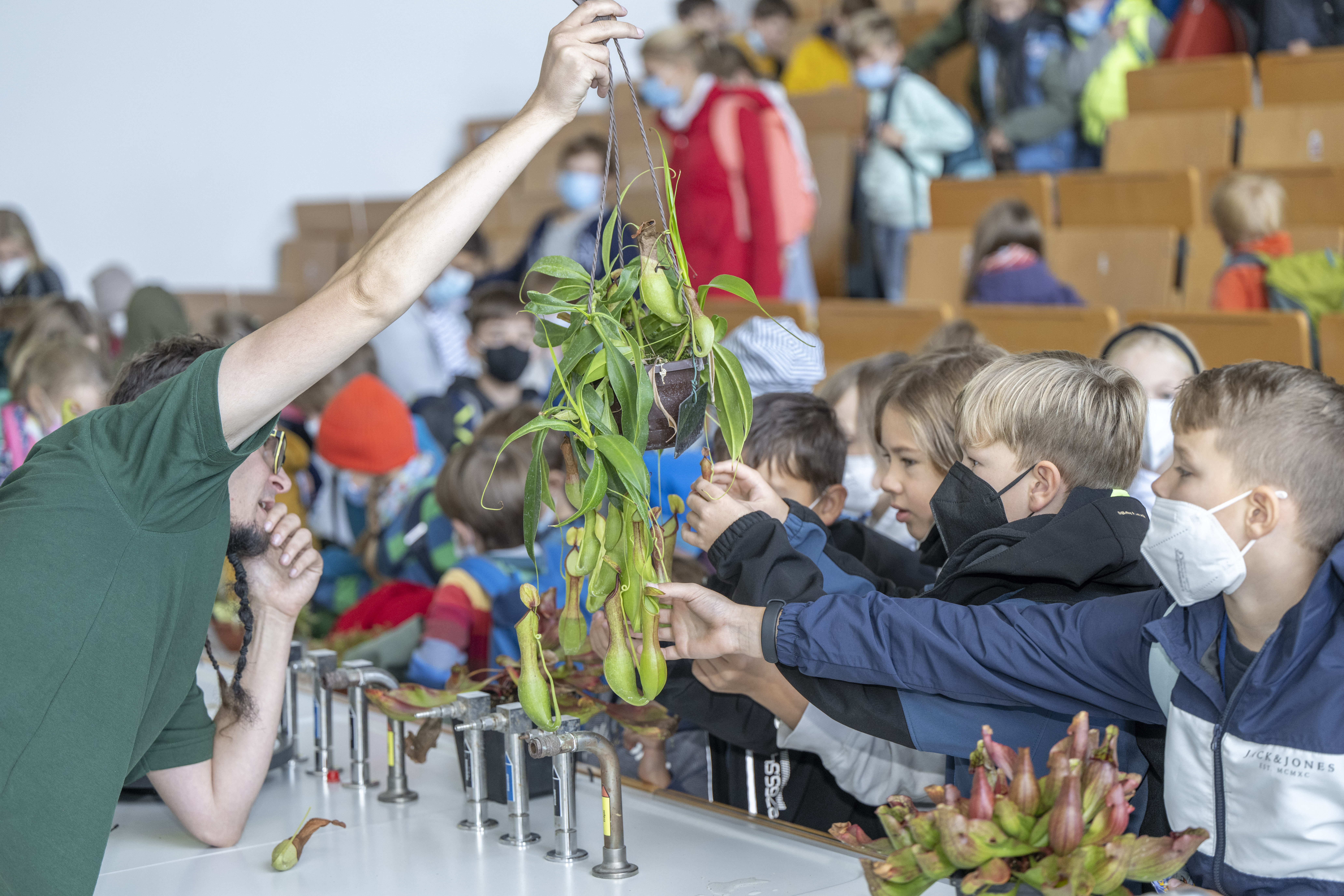 2023_087_Kinderuni-Thomas-Roese_DSC2697: Steffen Ramm vom Botanischen Garten führt durch die Welt der fleischfressenden Pflanzen. Foto: Thomas Roese