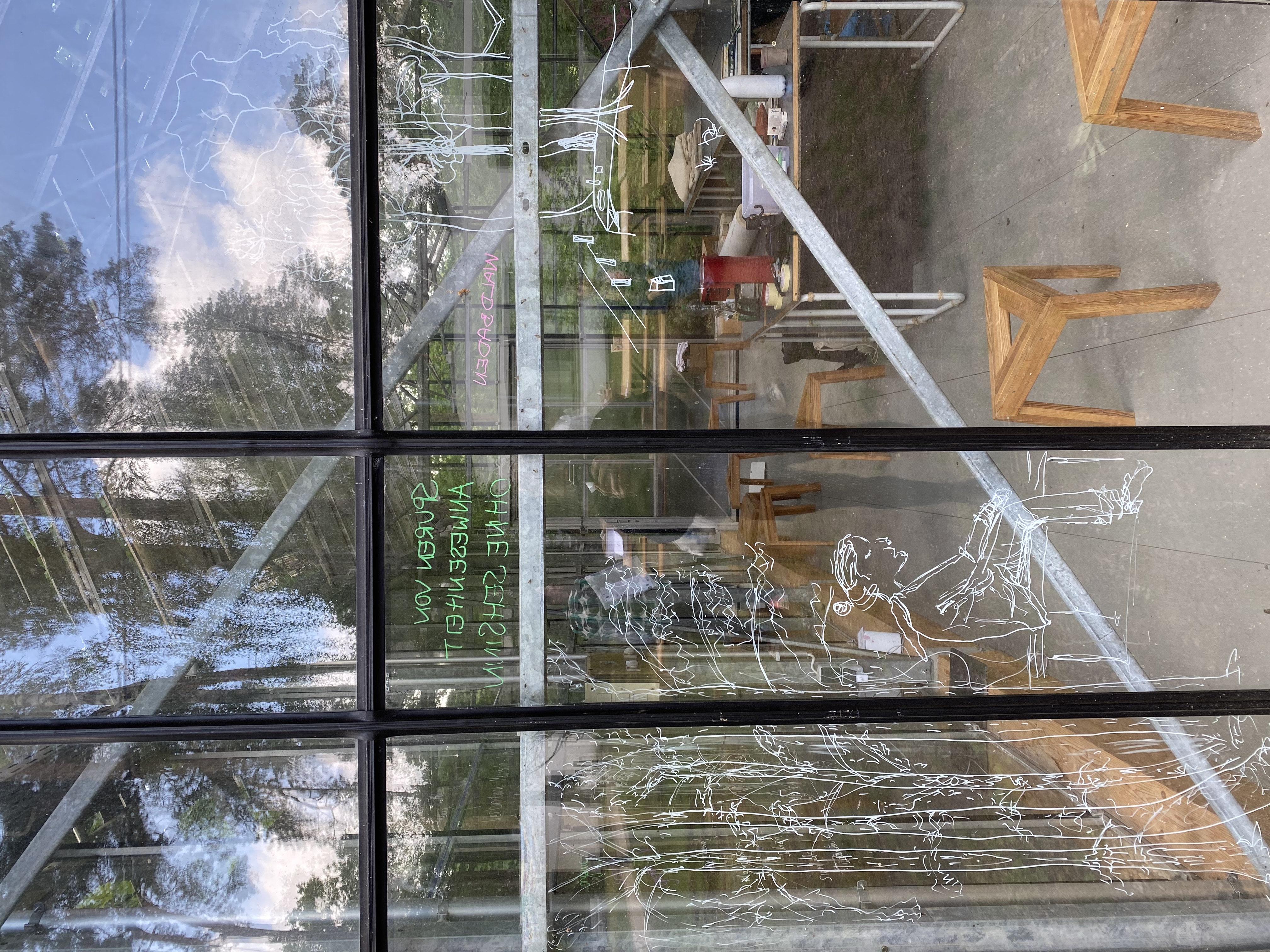 Foto: „Von Bäumen und Menschen/Waldraum“ – Arbeitssituation für die Ausstellung auf dem Campus Golm (Foto: Hanne Stohrer)