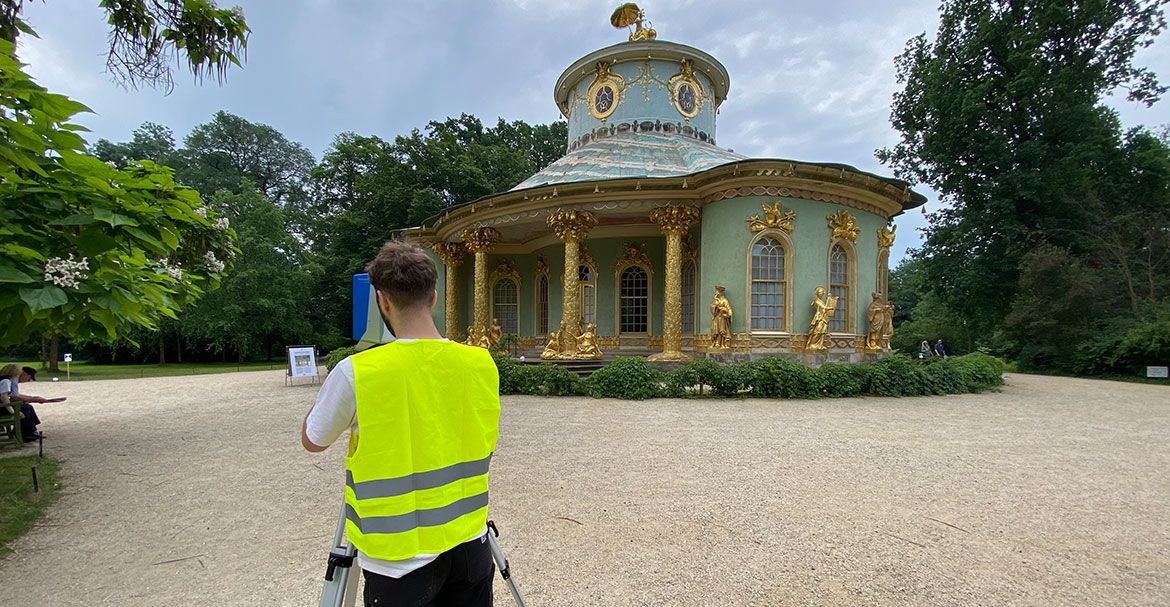 Sie haben mithilfe eines Laserscanners, einem rotierenden Laser, der auch als LiDAR bezeichnet wird, ein virtuelles 3D-Modell erstellt. Diese werden in verschiedenen Disziplinen eingesetzt und erlauben eine maßstabgetreue Umsetzung der realen Welt. Dabei werden z.B. Gebäude und Umgebung genau vermessen und in allen Dimensionen – inklusive der RGB Farben – erfasst. Als Anwendung mit einem terrestrischen Laserscanner haben wir das Chinesische Teehaus im Schlosspark Sanssouci gewählt.