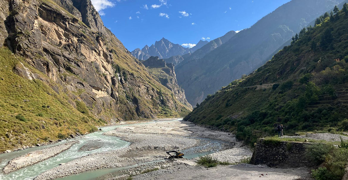 Wir fahren am Rishiganga-Wasserkraftwerk vorbei, das durch die Sturzflut im Bezirk Chamoli in Uttarakhand im Februar 2021 vollständig zerstört wurde. Dieses Wasserkraftwerk befand sich in der Bauphase und hatte eine geplante Kapazität von 13,2 Megawatt.