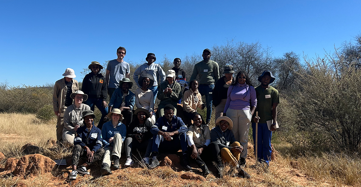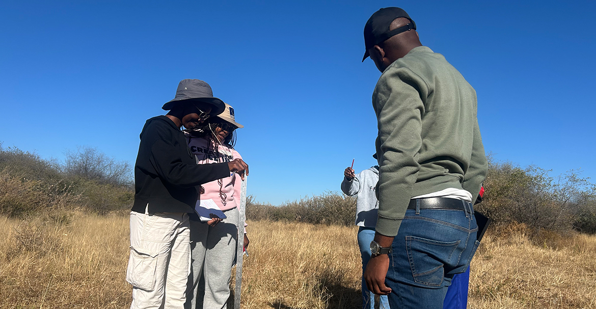 An der zweiten Station zeigen uns Dr. Mark Bilton und NUST-Doktorand Nali Moyo, wie Vegetationsbedeckungen geschätzt werden. Wir verwenden ein ein mal ein Meter großes Quadrat, das zufällig entlang eines zehn Meter langen Transekts platziert wird, um die Pflanzenvielfalt zu bewerten. In jedem Quadrat schätzen wir den prozentualen Anteil und die Bedeckung jeder Art. Zusätzlich notieren wir die Höhen. Wir beobachten, wie Sträucher günstige Mikrolebensräume für krautige Arten schaffen können, was oft zu einer höheren Artenvielfalt und -häufigkeit im Vergleich zu offenen Flächen führt.