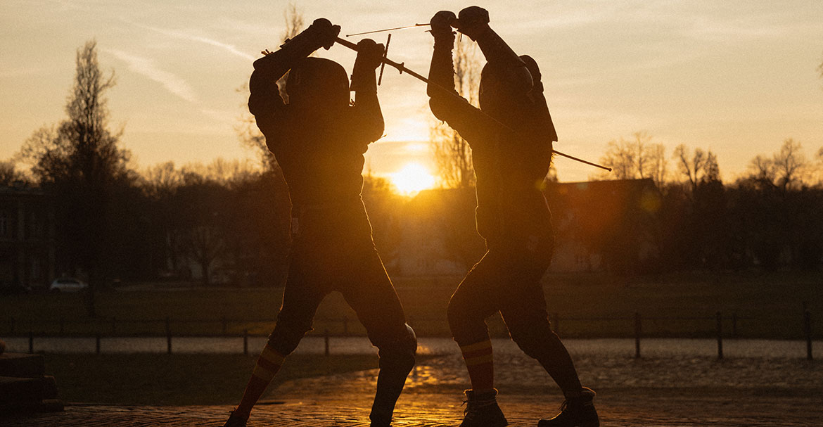 Bei aller Technik behalten die Sportler*innen jedoch stets die reale Kampfsituation im Hinterkopf. Co-Trainer Eike Jamrath gibt einem Kursteilnehmer, der gerade einen Treffer gelandet hat, den Tipp: „Wer trifft, sollte trotzdem immer einen Schritt zurück machen. Denk dran, der will dir Böses!“ Bei bestimmten Aspekten orientiert man sich hingegen am modernen Fechten: „Gewisses Know-how ist nicht historisch übermittelt, zum Beispiel Abstände beim Kampf oder andere Sicherheitsstandards.“ Beim Sportfechten gibt es eine lange, ungebrochene Tradition und etablierte Regeln, während man erst ab dem späten 20. Jahrhundert begann, den historischen europäischen Schwertkampf wieder systematisch zu lehren. Und dieser ist seither stetig beliebter geworden: „Wir wachsen schneller, als das olympische Fechten schrumpft“, freut sich Eickelmann.