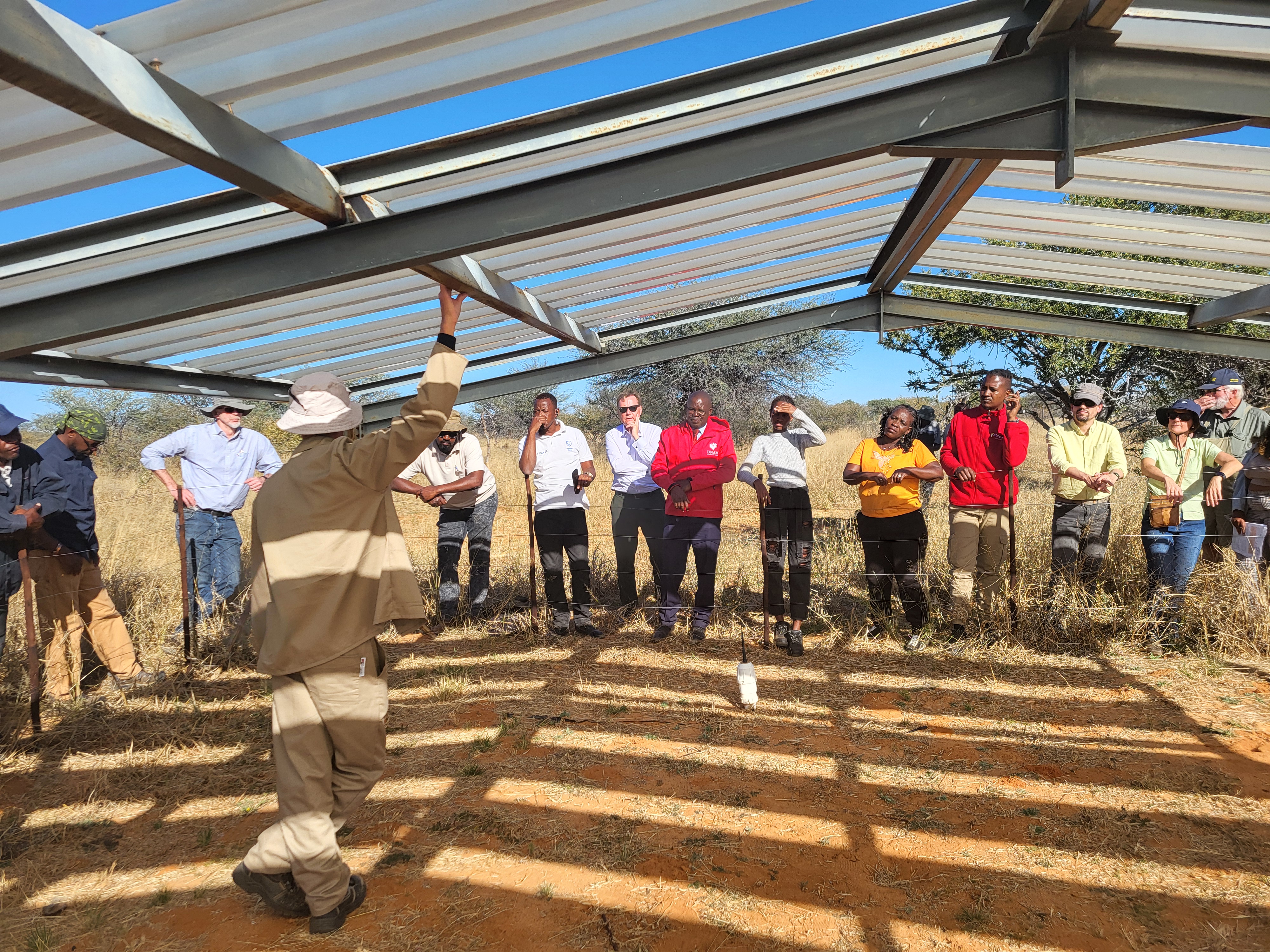 2025_067_1_NamTip_ExperimentTipEx: Teilnehmende des ersten Stakeholder-Workshops besuchen das großflächige Feldexperiment des NamTip-Projekts in der Waterberg-Region.Dr. Mark Bilton von der Namibia University of Science and Technology erläutert die experimentellen Aufbauten, darunter Regenausschlussdächer zur gezielten Simulation von Dürrebedingungen. Das Experiment dient dazu, die Auswirkungen extremer Klimabedingungen und unterschiedlicher Weideregime auf die Stabilität von Savannenökosystemen besser zu verstehen. Foto: Anja Linstädter