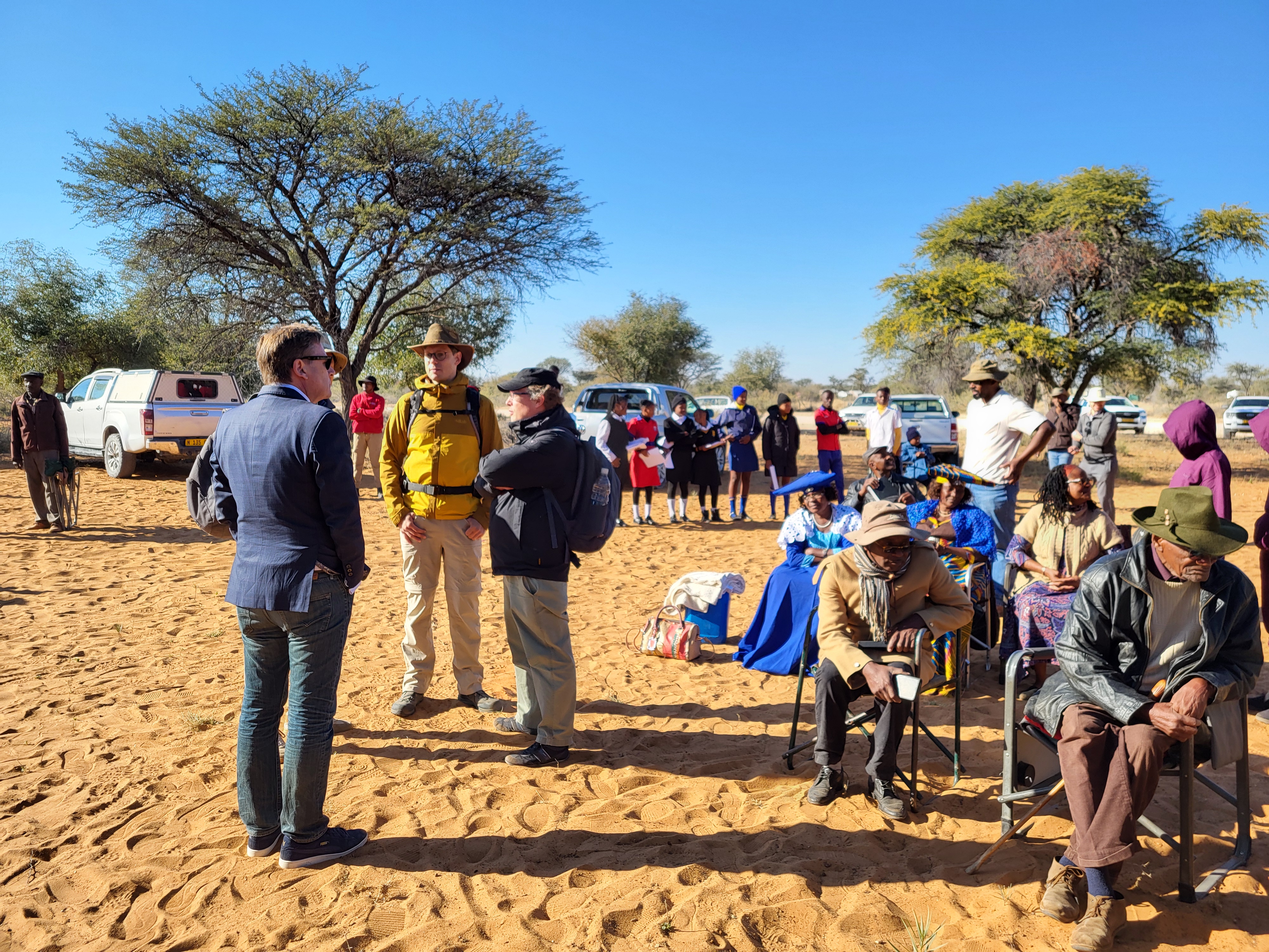2025_067_3_NamTip_FamerDay_CommunalAreas: Prof. Oliver Günther, Ph.D., im Gespräch mit Wissenschaftlern des NamTip-Teams während des zweiten Stakeholder-Workshops in der Waterberg-Region. Der Workshop richtete sich an Vertreterinnen und Vertreter kommunaler Gemeinschaften der OvaHerero und widmete sich praxisnahen Ansätzen zur Wiederherstellung degradierter Weideflächen.Foto: Anja Linstädter