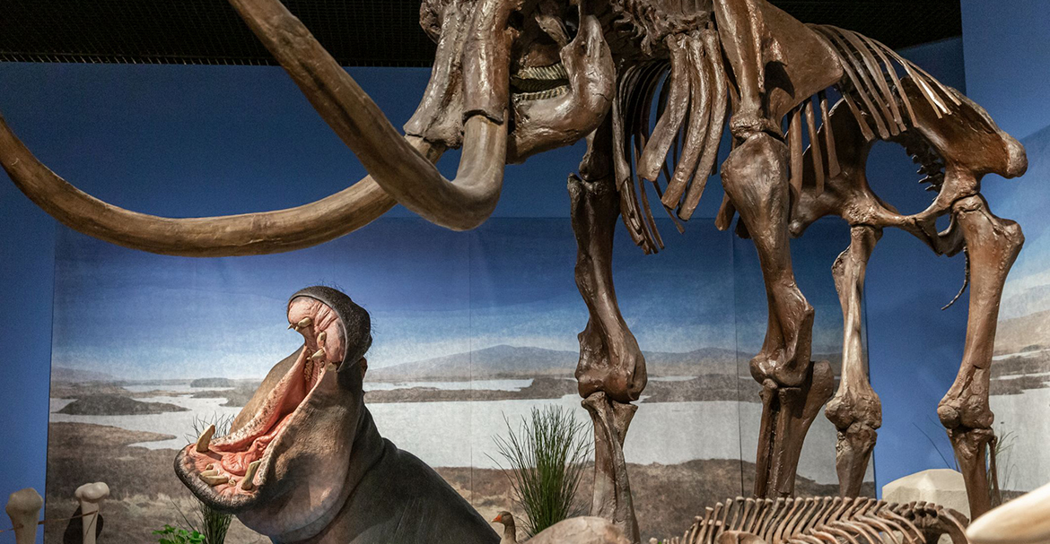 2025_091_EISZEIT300_Flusspferd_rem: Flusspferde lebten am Oberrhein im gleichen Zeitfenster wie Mammuts. Hier trifft in den Reiss-Engelhorn-Museen die Rekonstruktion eines Flusspferdes auf ein Mammutskelett. Foto: Rebecca Kind