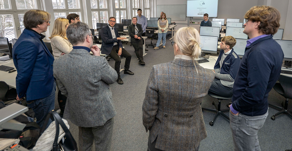 Die Organisatoren und Gäste der digitalen Probeklausur besuchen vorab den Prüfungsraum. In der Mitte (sprechend): Alexander Schulz, Leiter des ZIM der Universität Potsdam. Foto: Thomas Roese