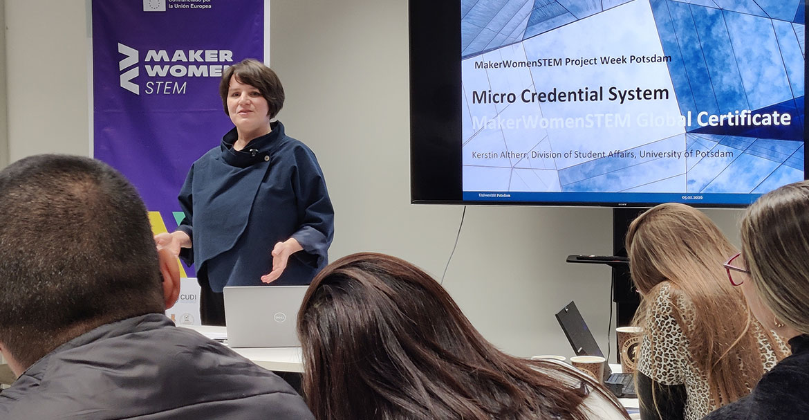 Neben dem ZfQ und Kerstin Altherr (Dezernat 2) brachten Mitarbeitende des MINT-Teams der Universität Potsdam, des Koordinationsbüros für Chancengleichheit sowie des Career Service ihre Expertise in die Bereiche Training, Zertifizierung und Netzwerkaufbau ein. Praktische Impulse – insbesondere zur Gestaltung geeigneter physischer Lernumgebungen – erhielten die Projektmitglieder bei Besuchen der Maker Spaces am Hasso-Plattner-Institut sowie der Machbar im Freiland Potsdam.