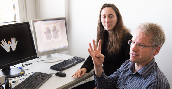 As part of the “Potsdam Embodied Cognition Group” he founded, Fischer’s current project examines the significance of finger counting for the representation of numbers in the brain. So far they have tested only adults. PhD student Elena Sixtus demonstrates a method in the laboratory for examining the relation between the fingers’ discrimination capacity and number processing, in which test subjects hold two handles that alternately stimulate their fingertips. While the subject says the number corresponding to the finger, the researcher can monitor the speed and precision of the information on a connected computer. Marks on the stimulated fingers appear on the monitor that displays two hands with the fingers spread.