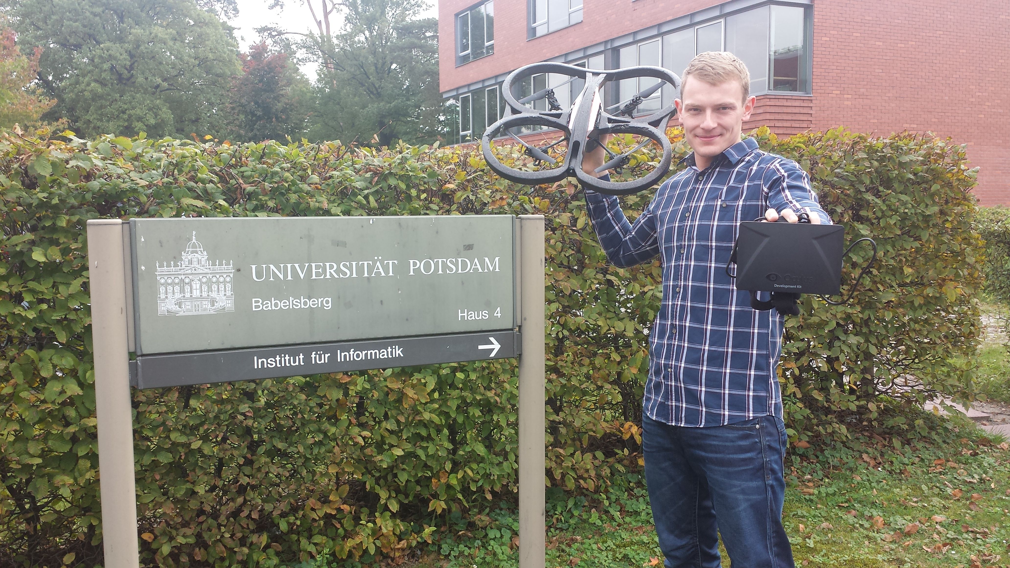 Bekanntermaßen stehen Flugdrohnen in Bezug auf ihre Verwendung in militärischen Zusammenhängen in der Kritik. Der 25-jährige Informatikstudent Matthias Weise nutzte die Technologie allerdings, um Kindheitserinnerungen zu wecken. Der Student des Instituts für Informatik und Computational Science der Universität Potsdam entwickelte in einer Belegarbeit ein virtuelles Cockpit zur Steuerung echter Flugdrohnen unter Nutzung moderner Multimedia-Technologie. Seine Erfindung mit dem Titel „RiftDrone“ wurde vom Deutschen Multimediapreis mb21 mit dem 2. Platz in seiner Altersgruppe ausgezeichnet.