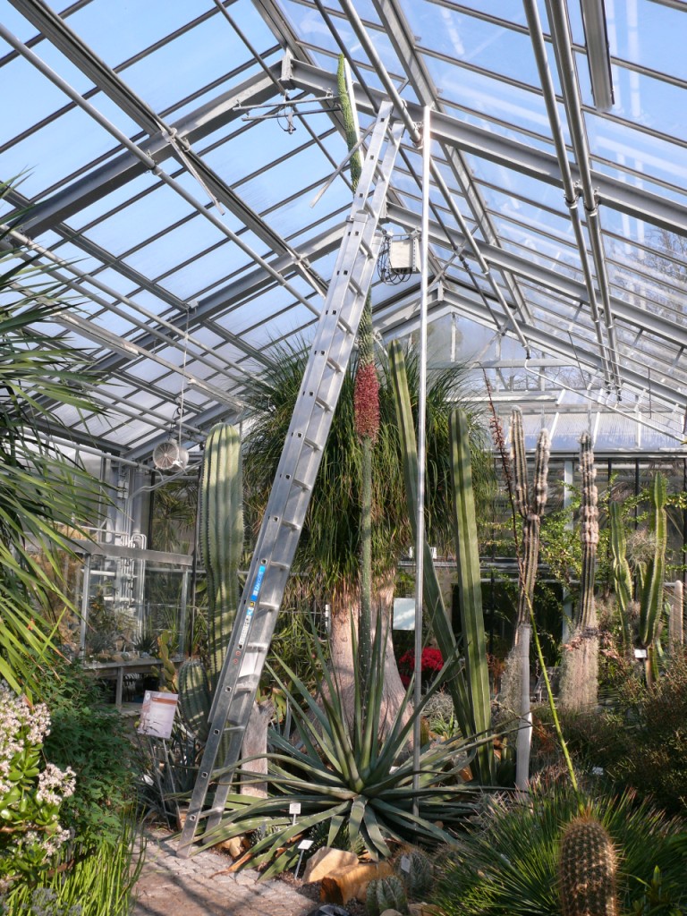 Der Blütenstand der Löwenschwanz-Agave hat ungefähr zehn Zentimeter unterhalb des Gewächshausfirsts das Höhenwachstum eingestellt. „Als ob die Agave gewusst hätte: hier geht’s nicht mehr weiter“, sagt der Kustos des Botanischen Gartens, Dr. Michael Burkart. Die gigantische Ähre erblüht nun in düsterem Kupferrot von unten nach oben. Die geöffneten Antheren bringen noch einen gelben Farbakzent hinein. „Der Anblick ist spektakulär“, schwärmt Burkart.