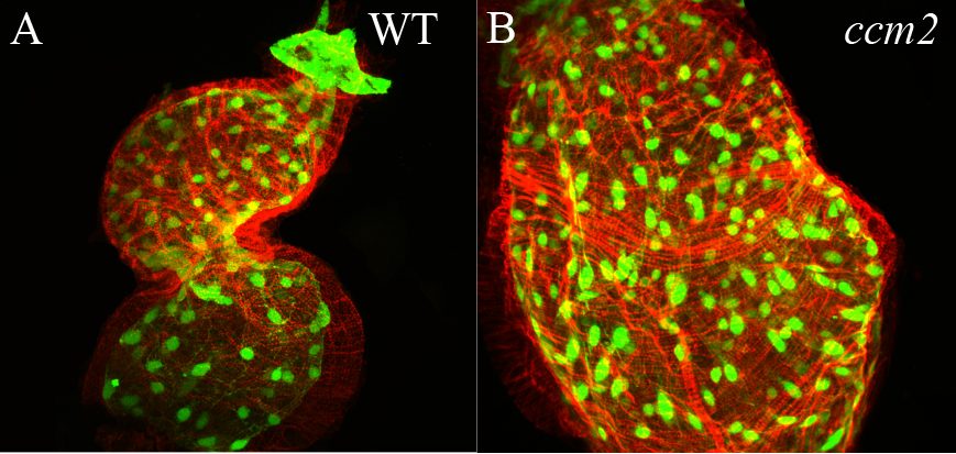 Foto: Konfokalmikroskopische Aufnahme des Herzens eines Zebrafischembryos. Der Verlust eines bestimmten Proteins führt zu einer ballonartigen Vergrößerung des Herzschlauchs (rechts). Fotos: Salim Seyfried und Marc Renz.