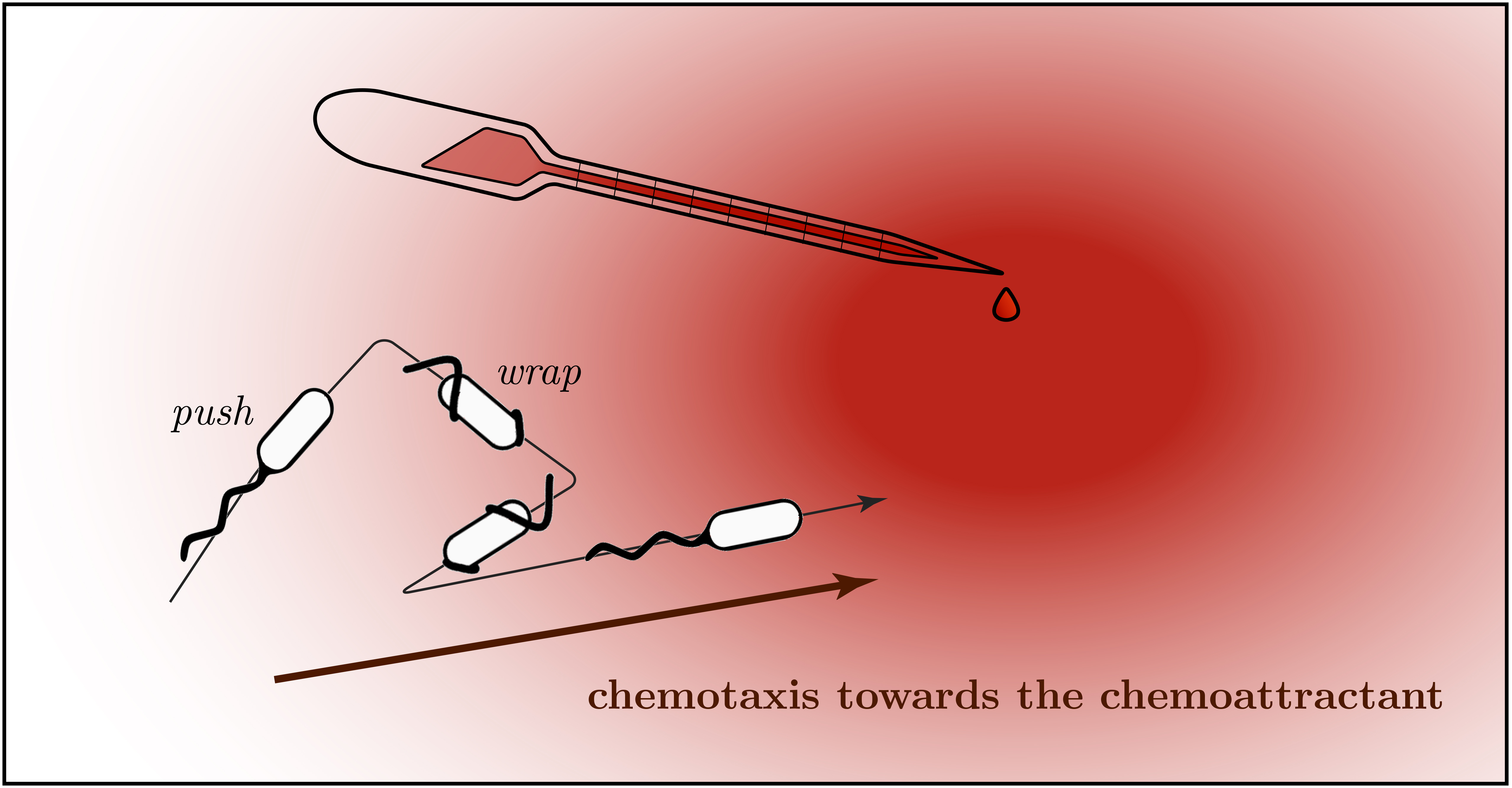 Image: Schematic representation of a bacterium with two motility modes, push and wrap, swimming towards the source of an attractant. Image: Dr. Robert Großmann.