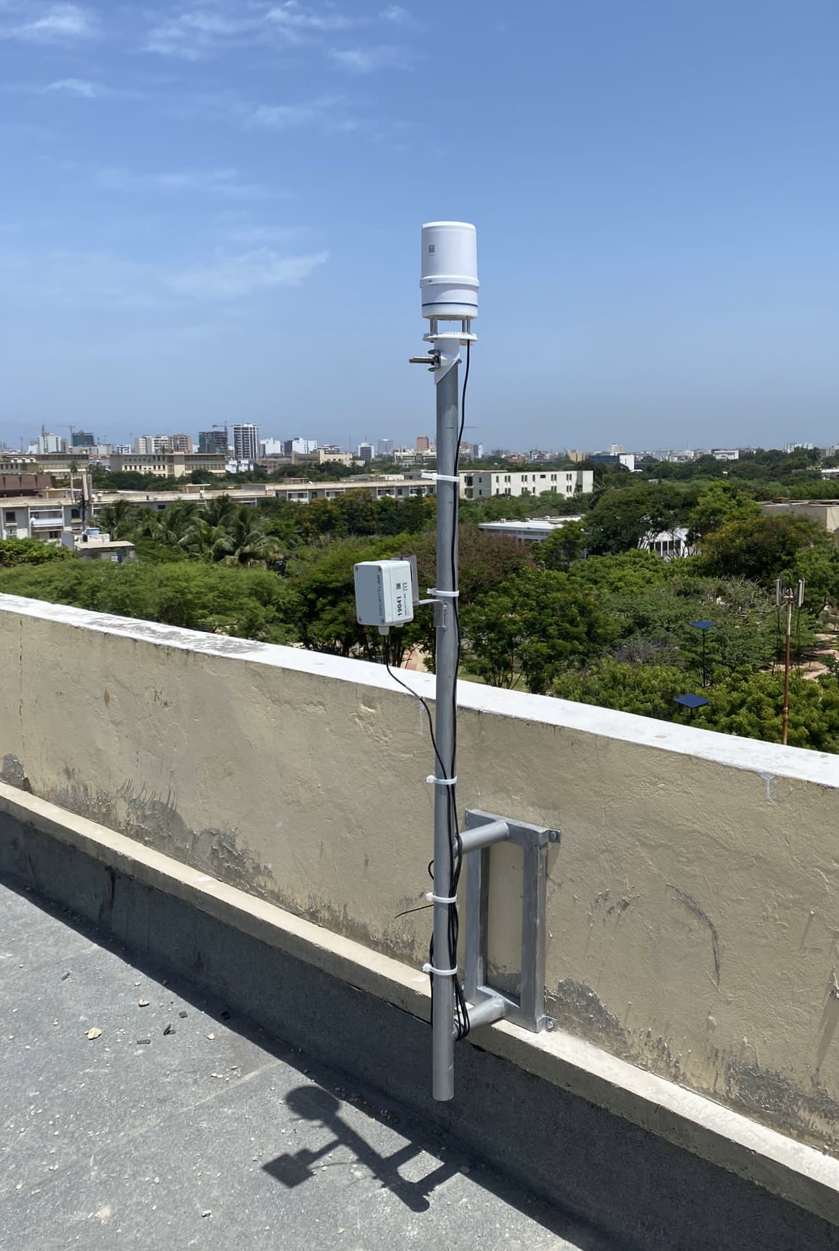 2024_009_Dakar3_ILKruse: Automatic weather station on top of a building of Cheikh Anta Diop University in Dakar. Photo: Irene Livia Kruse