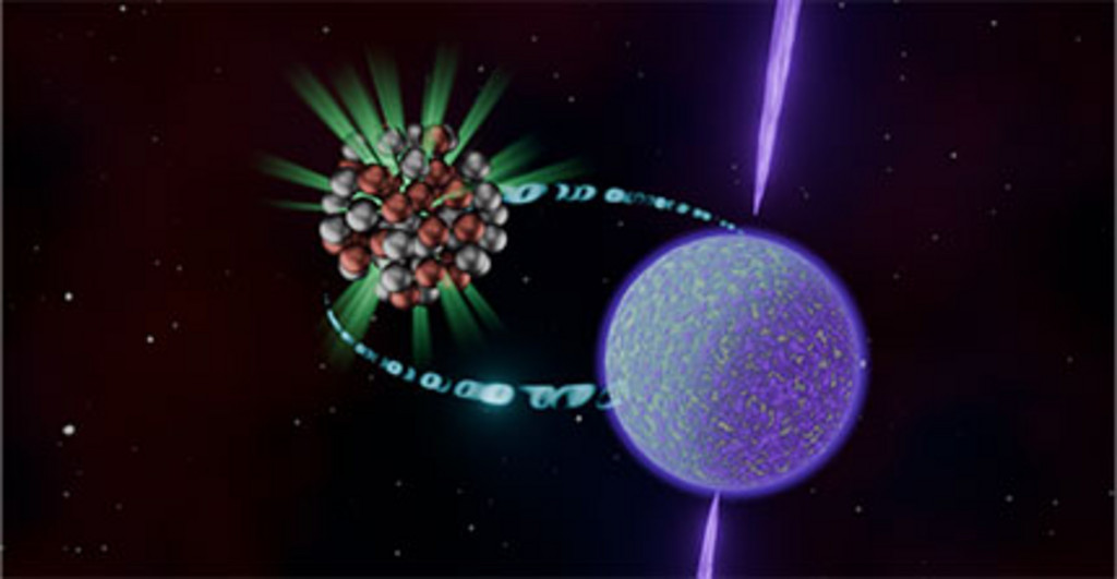 Image: Artistic representation of a neutron star and a nucleus. It symbolizes how knowledge about neutron stars can answer questions from nuclear physics and vice versa. Image: Hauke Köhn.