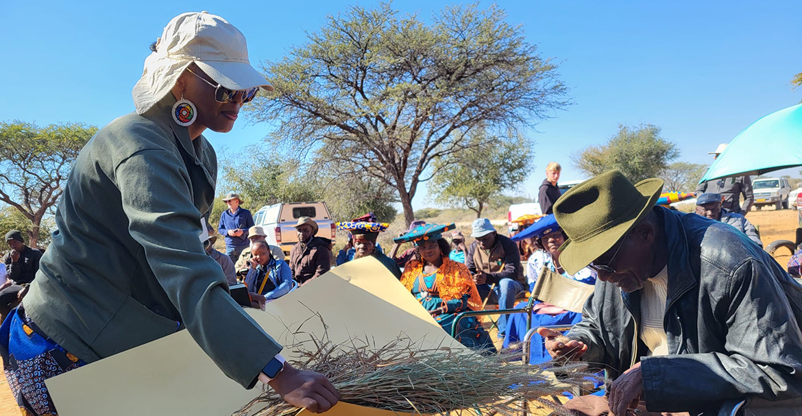 Prof. Anja Linstädter (University of Potsdam) then provides a brief introduction to the NamTip project, outlining its goals and introducing the concept of ecological tipping points. Next, Dr. Clara Nesongano (UNAM) presents indicators that can be used by farmers to determine the condition of their rangeland. In her highly interactive talk, she presents grass samples that can serve as proxies for rangeland conditions, sparking great interest among the gathered farmers. She compares the rangeland to a sick person, saying that just as rest and medicine gradually heal someone, changes to rangeland might not be immediately visible, but over time they can lead to restoration.
