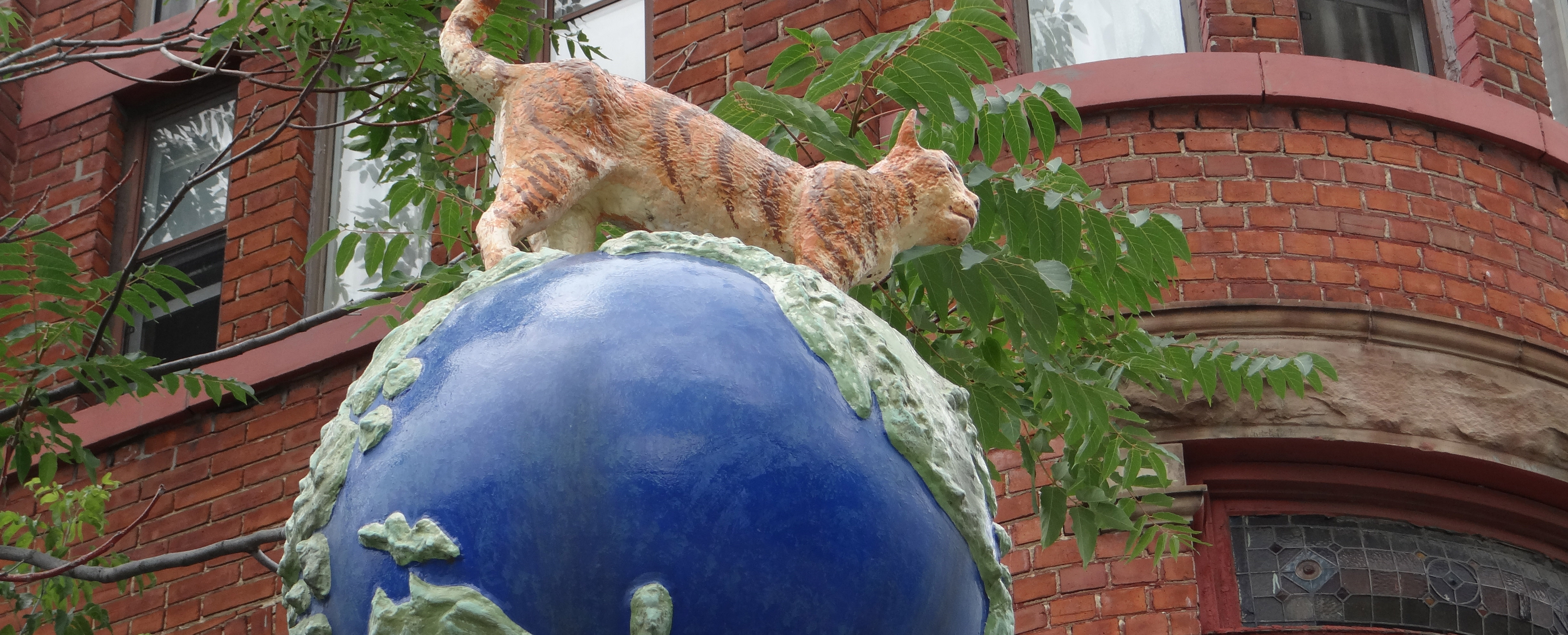 Skulptur von Katze auf Globus vor Gebäude auf Campus