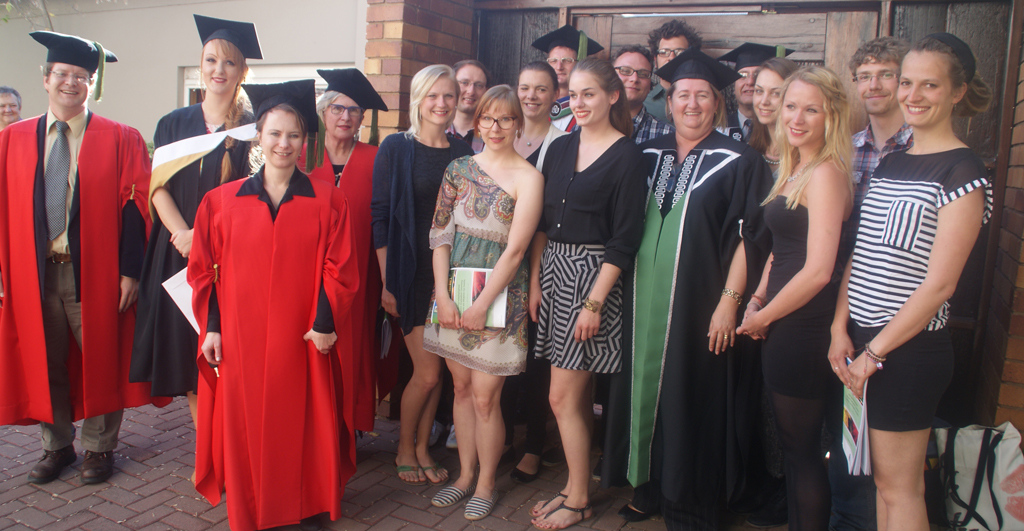 Auch die südafrikanische Nationalhymne vereint die Vielfalt Südafrikas und enthält Strophen in fünf verschiedenen Sprachen: Xhosa, Zulu, Sotho, Afrikaans und Englisch. Selbst Ansprachen werden in unterschiedlichen Sprachen gehalten. Wir erfahren später, dass nicht einmal die anwesenden Professoren jedes gesprochene Wort verstehen. Nach der offiziellen Zeremonie werden wir zu einem nahezu königlichen Abendessen eingeladen. Die Universität richtet für die frisch gebackenen Doktoren, Doktorinnen und deren Familien ein gemeinsames Essen aus, an dem auch wir teilnehmen dürfen. Wieder sind wir von der Feierlichkeit zutiefst beeindruckt. Die Lehrenden wie auch der Direktor der Universität halten engen Kontakt zu ihren Studierenden und Absolventen/innen. Da jeder Professor oder Professorin nur wenige Studierende unterrichtet, ist hier das Verhältnis der Studierenden zu den Unterrichtenden sehr vertraut. Oftmals unterstützen die ehemaligen Studierenden nach ihrem Abschluss die Universität finanziell. Wir unterhalten uns angeregt mit den Anwesenden der North-West University. Erneut werden wir internationalen Gäste sehr freundlich empfangen. Wir sind sehr glücklich über diese Zusammenarbeit und hoffen, dass es bald erneut zu solch einem gelungenen Austausch kommt. Und insgeheim wünschen wir uns alle, wir würden selbst so eine wunderschöne Abschlusszeremonie an unserer Universität erhalten.