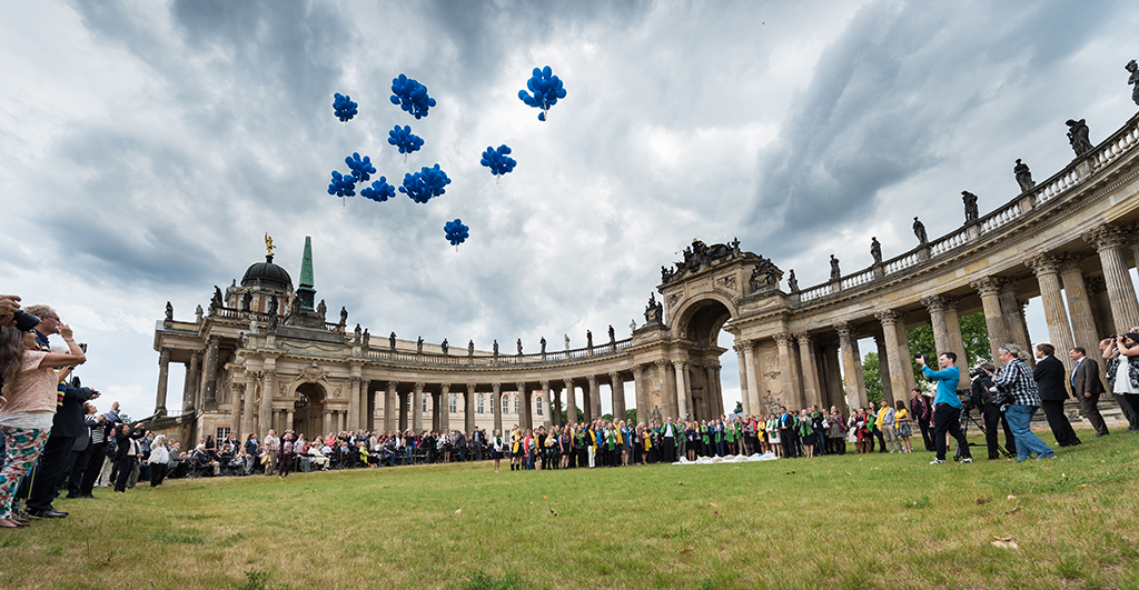 Eine neue Tradition ist begründet worden: Vor der historischen Kulisse der Kolonnade am Neuen Palais hat die Universität Potsdam am 18. Juni 2015 erstmals feierlich ihre Absolventinnen und Absolventen verabschiedet. Über 200 Bachelor- und Masterabsolventen sowie Promovenden waren – gemeinsam mit ihren Familien und Freunden – der Einladung ihrer Alma Mater gefolgt. Insgesamt kamen fast 700 Gäste ans Neue Palais.