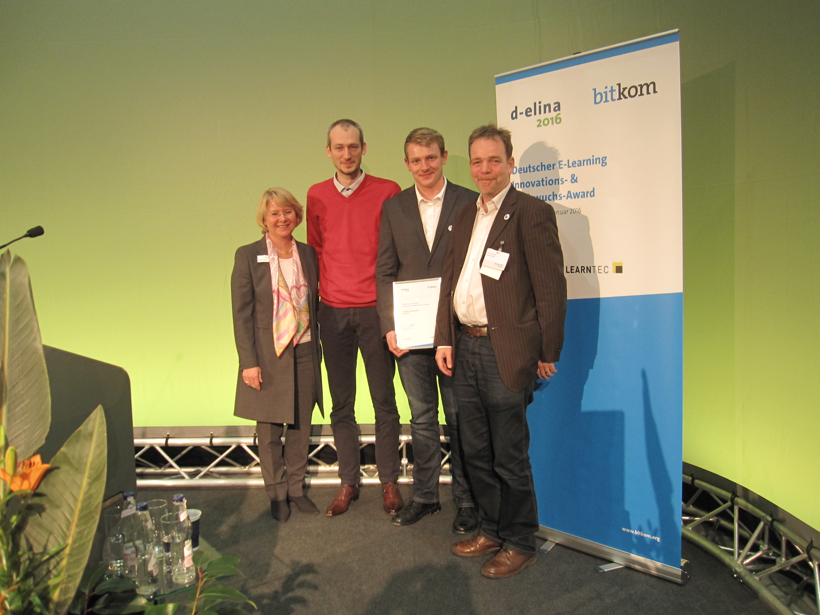 Foto: Sünne Eichler vom Kongress-Komitee der LEARNTEC übergibt den d-elina Award 2016 an Alexander Kiy, Matthias Weise und Jörg Hafer von der Universität Potsdam für das Projekt Campus.UP (Foto: Raphael Zender)