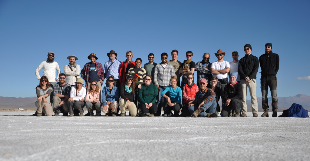 Wir durchqueren dann die „Salinas Grandes“, ein bedeutendes Becken, in dem Salze zur Gewinnung von Bor und Lithium abgebaut werden. Die Lagerstätten, die hier aus Seesalzen gewonnen werden, sind eine wichtige ökonomische Einnahmequelle des Landes. Hier müssen wir uns von einigen Exkursionsteilnehmenden verabschieden, die für ihre Geländearbeiten auf dem Puna-Plateau bleiben. Das strandweiße Salz bietet da die perfekte Kulisse für das Abschiedsgruppenbild.