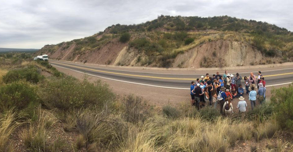 Alle 35 Teilnehmer erreichen rechtzeitig den vereinbarten Treffpunkt. Wir beginnen unseren Tag im Umland von Mendoza. Den ersten Stopp machen wir auf der Spitze des Hausbergs „Cerro de la Gloria“ – der glorreiche Berg –, auf dem sich das Monument von San Martín, dem Befreier der argentinischen Bevölkerung, befindet. Im Schatten dieser in Südamerika geschichtsträchtige Persönlichkeit interessieren wir uns jedoch vorerst eher für die tektonische Entwicklung des Vorlandbeckens. Von unserem Aussichtspunkt können wir bereits einige markante Falten und Störungen erkennen, die zur Bildung der Landschaft beitragen.