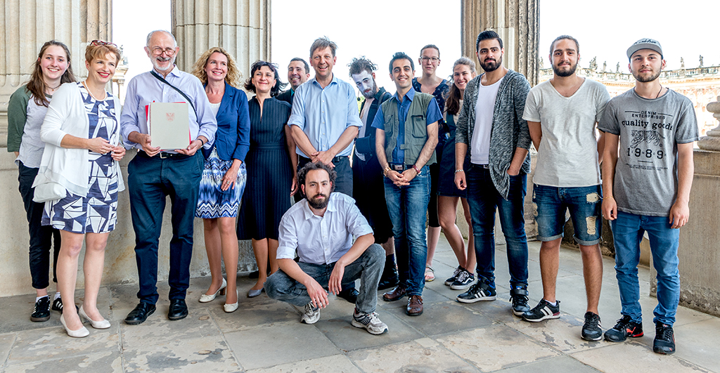 Theater schafft Integration: Das zeigten Studierende der Universität Potsdam, die gemeinsam mit jungen Migranten aus neun verschiedenen Ländern Shakespeares romantische Komödie „Der Sturm“ erarbeitet haben. Und das gleich in mehreren Sprachen! Unter dem Titel „Der Sturm - The Tempest – عاصفة“ wurde die ungewöhnliche Inszenierung in diesem Frühjahr im Potsdamer Treffpunkt Freizeit erstmals aufgeführt.  Dank einer Förderung durch das brandenburgische Ministerium für Wissenschaft, Forschung und Kultur in Höhe von 10.000 Euro kann  die Inszenierung nun auch in Schulen und auf Kulturbühnen in Brandenburg gezeigt werden. Kulturministerin Dr. Martina Münch übergab am Freitag einen symbolischen Scheck an Prof. Dr. Dieter Wagner von der Universitätsgesellschaft und die Projektleiterin  PD Dr. Ljuba Kirjuchina vom Bereich Studiumplus/Schlüsselkompetenzen an der Universität Potsdam.