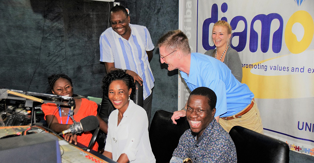 Zur gleichen Zeit ist der Rest der Gruppe zu Gast beim Sender des Campus Radios Diamond FM. Wir werden zunächst von Emokhare Paul Anthony, dem Direktor des Senders, begrüßt, der uns dessen Produktionsweise erklärt. Der Sender ist nicht kommerziell und dient sowohl der Unterhaltung als auch der Bildung seiner Zuhörer. Anthony betont dabei, dass fast alle, die hier arbeiten, freiwillige Studierende oder Praktikanten aus verschiedenen Fachrichtungen seien. Die Qualität des Senders wird dadurch gesichert, dass es pro Einheit zugleich ausgebildete Mitarbeiter, wie z.B. Techniker, Redakteure und Ingenieure, gibt, welche die Produktion überwachen und den Studierenden beratend zur Seite stehen. Immerhin wird der Radiosender nicht nur auf dem Gelände der Universität gehört, sondern darüber hinaus im ganzen Bundesstaat.
