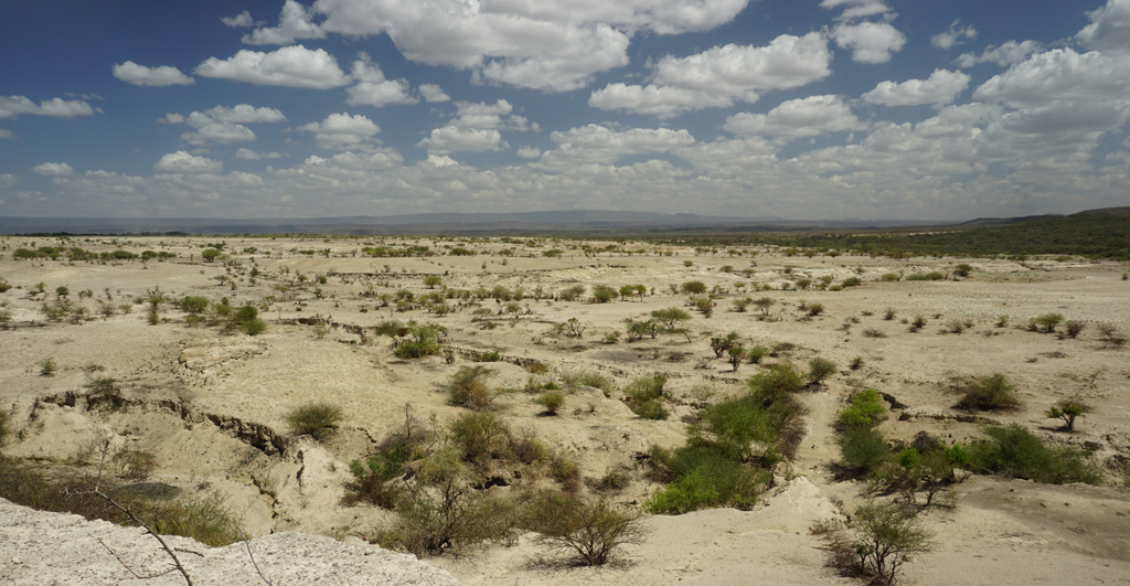 Nach einer ausgiebigen Einführung und einem Überblick über die großräumige Geologie Kenias fahren wir hinab in die Becken des Grabensystems. An dessen Ostrand durchqueren wir auch unterschiedliche Vegetationszonen, die von dichtem Baumbewuchs bis zur Dornensavanne reichen. Wir erreichen das Innere des Grabens in der Nähe von Olorgesailie, wo schon der bekannte Paläoanthropologe Louis Leakey in den 1940er Jahren Steinwerkzeuge der frühen Riftbewohner ausgrub. Vor knapp einer Million Jahren gab es hier noch eine ausgedehnte Seenlandschaft. Wir untersuchen die Ablagerungen eines dieser Seen, den früheren Lake Olorgesailie. Die Seesedimente bestehen hauptsächlich aus Diatomit – ein sehr leichtes, helles, pulverartiges Material, das wir auch in Norddeutschland in den Ablagerung der letzten großen Zwischeneiszeit hin und wieder finden. Während unserer Analysen kommt ein starker Wind auf, der den Staub der trockenen Seeablagerungen durch die Luft wirbelt.