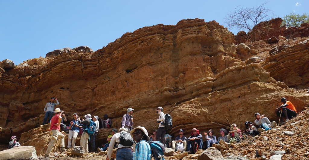 In glühender Mittagshitze und auf der Wanderung durch die tief eingeschnittene Schlucht diskutieren wir die unterschiedlichen Sediment- und Vulkangesteine sowie die Störungssysteme, die für ihre Deformation verantwortlich sind. Wir lernen, dass sich das Riftbecken von Olorgesaile noch immer weiter bildet – durch mit Erdbeben verbundene Absenkung. Anschließend besteigen wir ein vulkanisches Plateau. Loses Geröll und dornige Hartlaubgewächse erschweren den Aufstieg. Die Köpfe sind rot, eine Mischung aus Schweiß und Sonnencreme läuft die Nacken hinunter. Oben erwartet uns ein fantastischer Blick auf den gegenüberliegenden Vulkan und die Ablagerungen von Olorgesaile. Unterbrochen wird unsere Diskussion der Geologie nur von einer Pavianfamilie, die uns Störenfriede entdeckt hat.