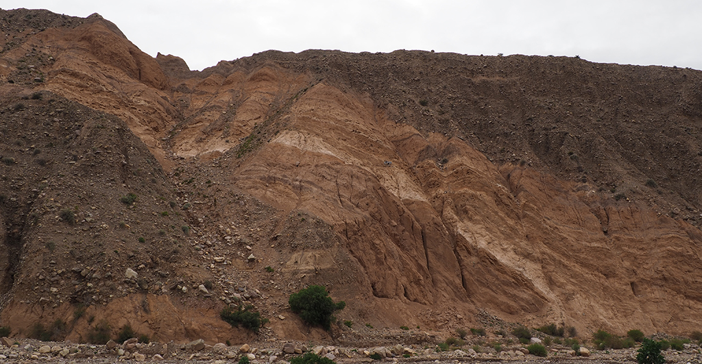 Wir beenden unseren Ausflug in Tilcara, einem kleinen Dorf talaufwärts von Purmamarca. Hier wurde die Maimará-Formation über mehr als 60.000 Jahre altes Flussgeröll geschoben. Die eindrucksvolle Störung zeugt somit von der bis heute andauernden Tektonik im Tal.