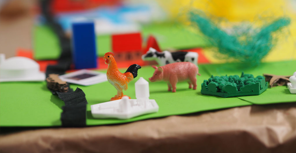„Es ist eine Sprache, die jeder sofort verstehen kann“, sagt Weber und nimmt ein kleines Tier aus Plastik in die Hand. „Und zwar unabhängig vom beruflichen oder sozialen Hintergrund.“ Die Teilnehmenden seiner Workshops kommen aus brandenburgischen Gemeinden, es sind Landwirte und Lehrer, Vertreter aus der Verwaltung und dem Einzelhandel oder auch von Umweltorganisationen. Anfassen, schneiden, falten, anordnen, bauen und im wahrsten Sinne des Wortes „begreifen“ – das alles ist hier ausdrücklich erwünscht. Es geht um neue Zukunftsstrategien, um Leitbilder, Visionen und Chancen für die Gemeinden – und vor allem darum, wie der Umbau der Wirtschaft hin zu einer Bioökonomie gelingen kann, die sich von fossilen Rohstoffen verabschiedet und stattdessen auf nachwachsende Ressourcen baut.
