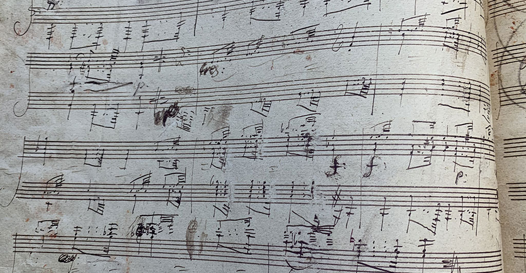 Die erste Visualisierung der Musik Beethovens sind die vor 200 Jahren geschriebenen Noten. In einem gemütlichen Sessel sitzend konnten die Besucher der Konzertausstellung ein Faksimile des Autographs gedruckt oder digital durchblättern und dabei die originalen Anmerkungen und Streichungen des Komponisten studieren. Überklebungen, Einlegeblätter, mit roter Tinte geschriebene Korrekturen geben bis heute Einblick in Beethovens Arbeitsweise und seine künstlerischen Intentionen.