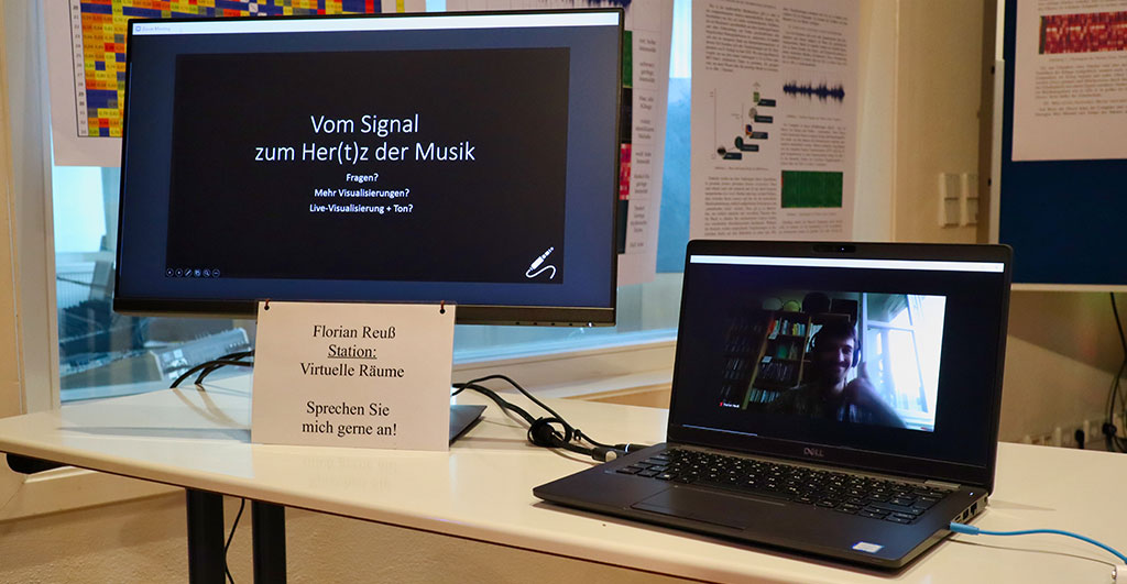 Doch lässt sich der Computer tatsächlich für die Musikanalyse nutzen? Was kann durch Algorithmen zuverlässig erfasst werden? Oder obliegt es allein dem Zuhörenden, zum Herz eines Musikstücks vorzudringen. Student Florian Reuß zeigte in der Ausstellung, mit welchen informationswissenschaftlichen Methoden Wissen über Musik aus Audiosignalen gewonnen werden kann und wie die Daten analysiert, visualisiert und gedeutet werden. Sein Kommilitone Oktavian Wojciechowski lud zu einem Rundgang durch sein digitales „Museums der Diabelli-Variationen“ ein, das er mit der von Gamedesignern und Architekten genutzten Software Unreal Engine geschaffen hatte. Darin fanden sich verschiedene Hörbeispiele und all die Analyse- und Darstellungsformen, die im Projektseminar entwickelt worden waren. Ein Ausflug in virtuelle Klangräume.