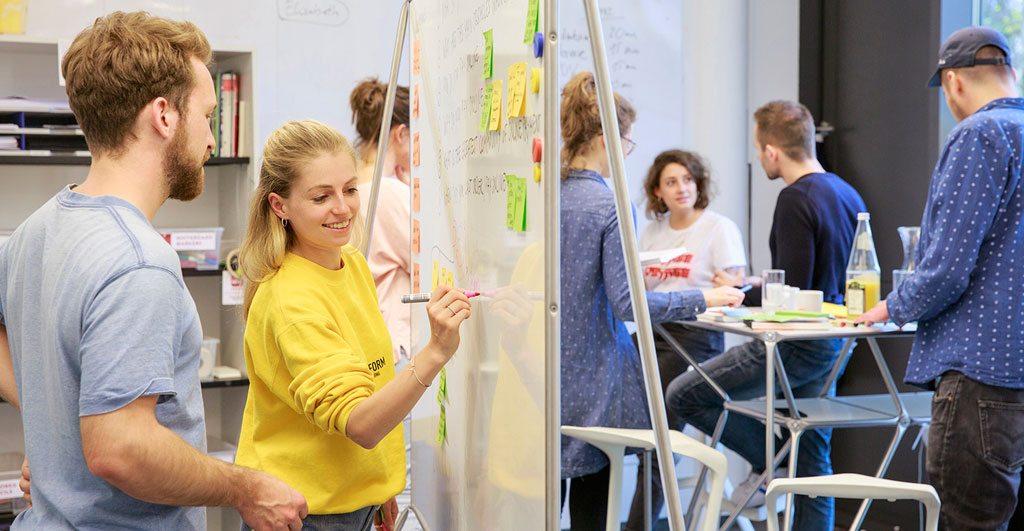 Im Austausch miteinander durchlaufen die Studierenden verschiedene Phasen im Innovationsprozess. Dabei lernen sie eine offene Fehlerkultur als notwendigen Bestandteil der Lösungsentwicklung zu etablieren und von dieser zu profitieren. Die Design Thinking-Teams bestehen aus jeweils fünf Studierenden verschiedener Fachbereiche und einem erfahrenen Coach, der sie während des gesamten Projektes begleitet.