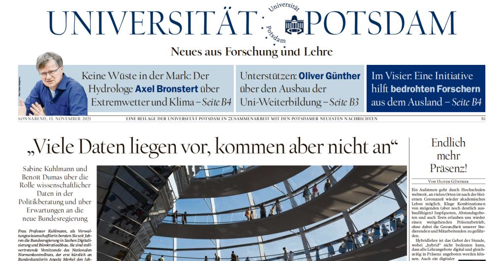 Ob Pandemie oder Klimawandel – in der Politik ist Expertenrat gefragt. Warum Forschungsdaten dort oft nicht ankommen, steht in der aktuellen Beilage der Universität Potsdam, die am Samstag im Tagesspiegel und in den Potsdamer Neuesten Nachrichten erschienen ist. Präsident Oliver Günther fordert in einem Interview mehr Fort- und Weiterbildung für Lehrkräfte, auch an Universitäten. Zu erfahren ist, wie es nach der Flutkatastrophe in der Eifel weitergeht und warum Brandenburg immer öfter auf dem Trockenen sitzt. Eine Studentin berichtet von einer Irak-Exkursion durch die „Autonome Region Kurdistan“ und eine Romanistin vom Gedankenlabyrinth eines italienischen Dichterphilosophen. Ganz zum Schluss heißt es „Hoppla, hier kommt Koppla!“ – ein Potsdamer Start-up, das das Baugewerbe revolutioniert.