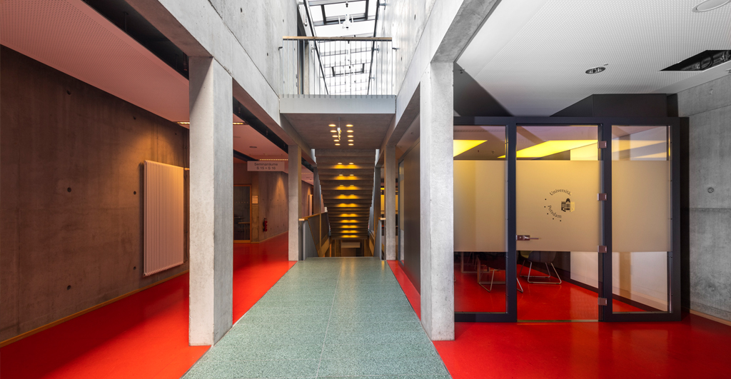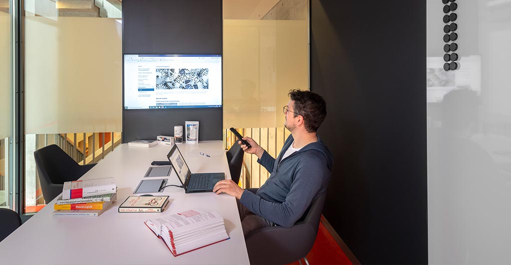 Bislang gab es im hoch frequentierten Haus 6 in Griebnitzsee nur wenige Rückzugsorte zum ungestörten Selbststudium. Auch für spontane Meetings zwischen Seminar und Vorlesung fehlte ein Ruhepol. Die beiden Acoustic Pods im Flur des 1. Obergeschosses bieten nun zwei Räume im Raum, die den Trubel vor der Tür lassen. Eine der Boxen lädt mit Tisch, Bildschirm und Whiteboard zur Teamarbeit ein, während die andere mit bequemen Sitzen als Lounge dient, perfekt zum Lesen oder für ein konzentriertes Gespräch. Beide Boxen haben Ladestationen, regelbares Licht und Belüftung. Wie viele Leute sich zugleich darin aufhalten dürfen, hängt allerdings von den Corona-Bestimmungen ab. Geöffnet sind sie täglich zwischen 8 und 20 Uhr.